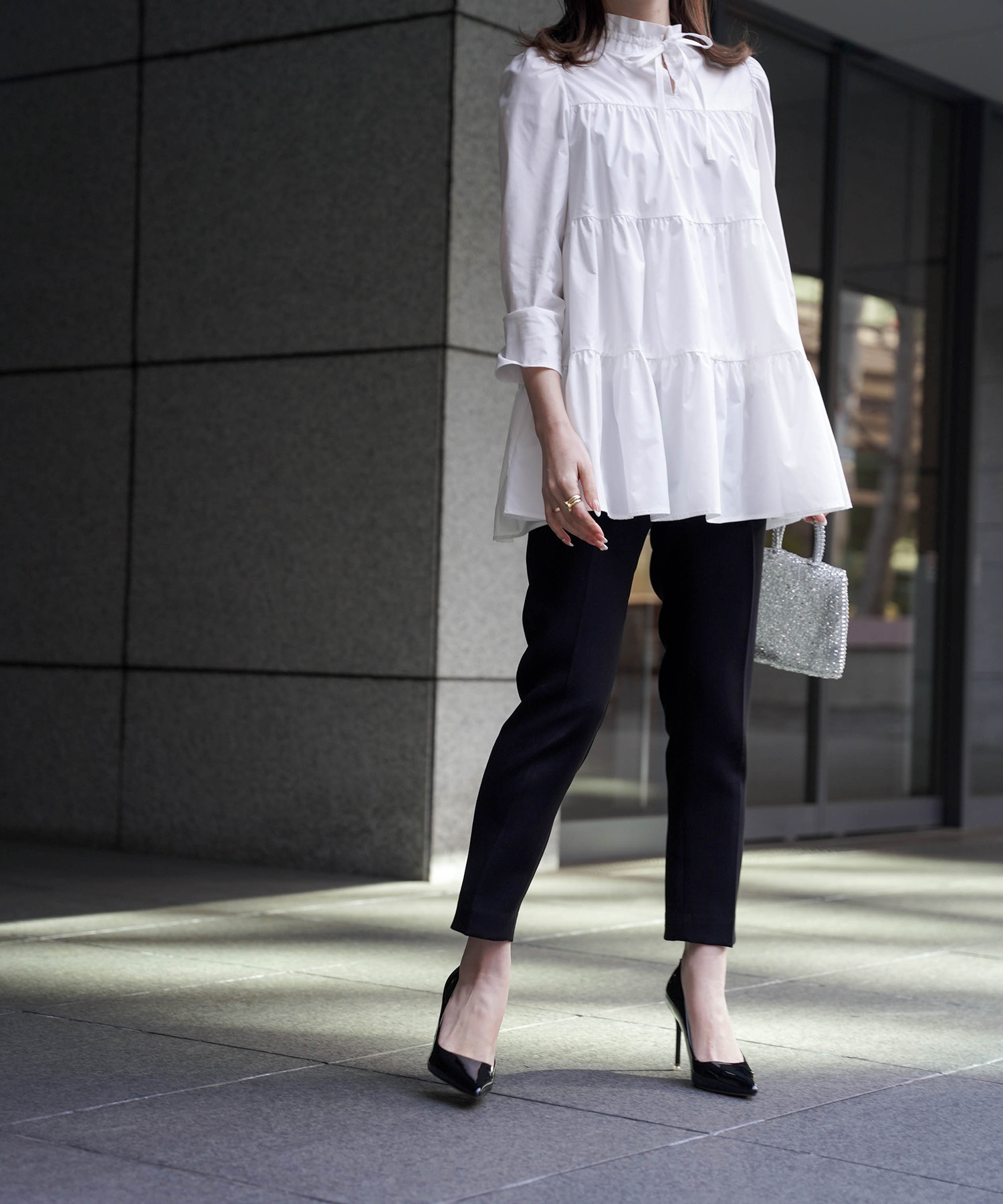 春にぴったりなふんわりティアードブラウス。華やかな着映えと、上半身の厚みをカバーしてくれるデザインで、薄着の季節に頼れる一枚です。清潔感あふれるホワイトが、爽やかな春の空気をまとわせます。