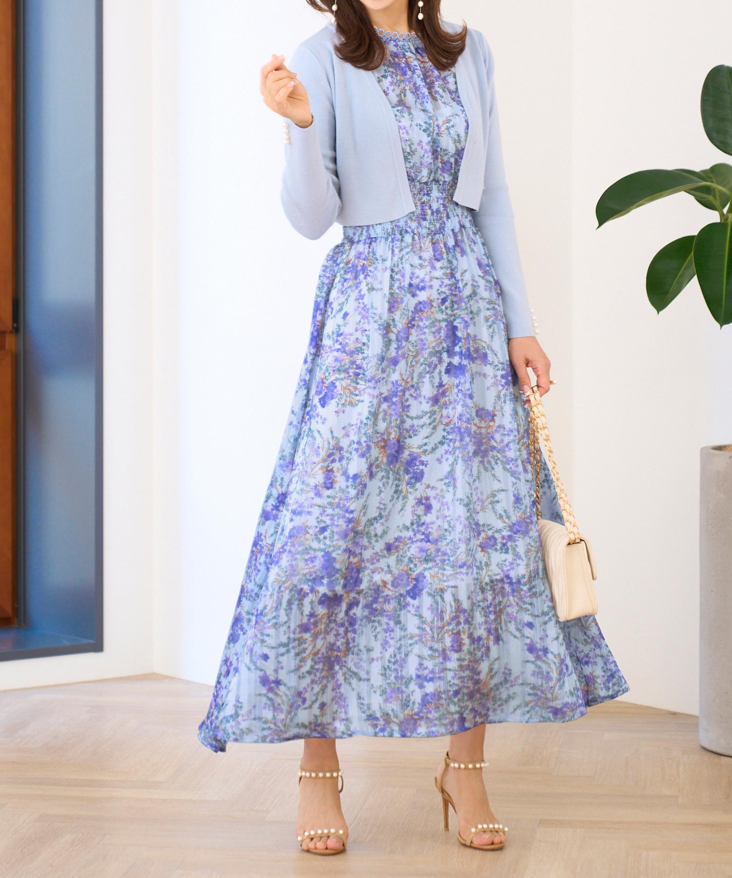体に優しくフィットするリラックスラインのロングワンピースは、毎年人気の定番アイテム。華やかなフラワー柄が、大人の女性らしさを引き立てます。女子会や食事会など、おしゃれに気合を入れたいシーンにぴったりなデザインです。