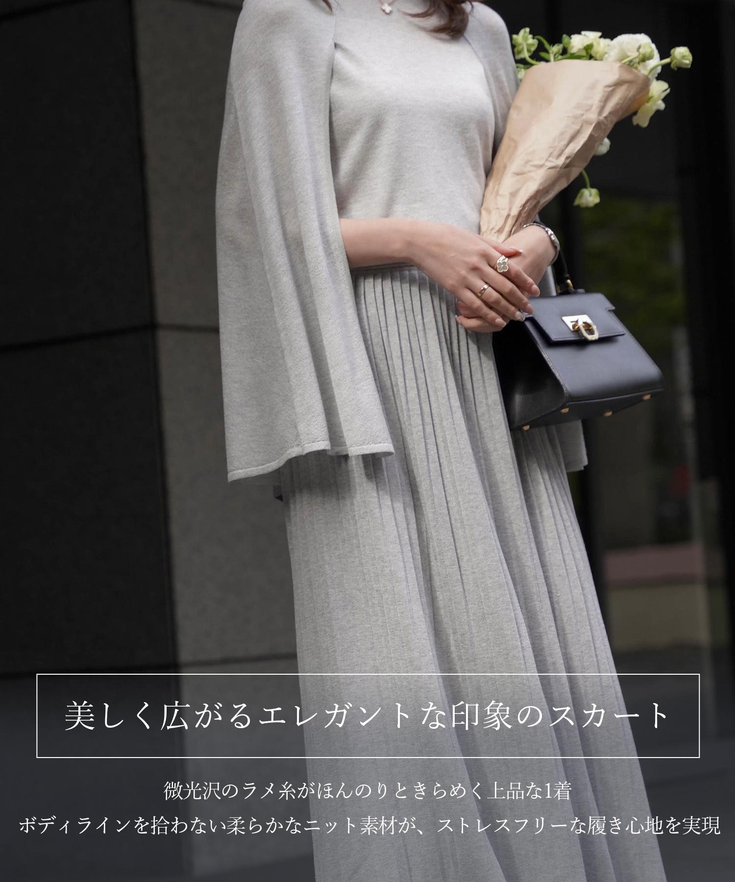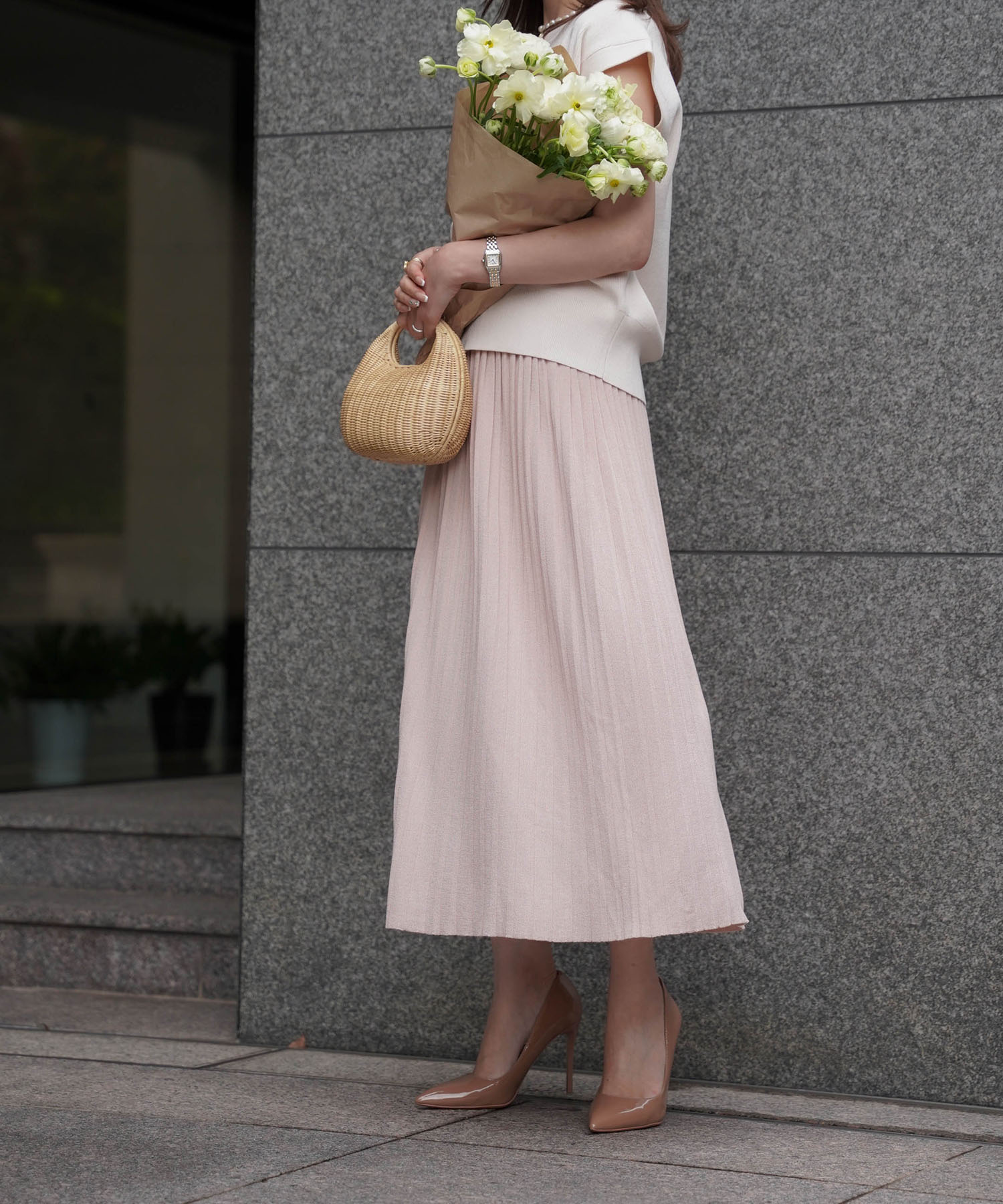 ラメ入りのニット素材で華やかさをプラスしたプリーツスカート。伸縮性のある柔らかな素材が心地よくフィットし、カジュアルな夏の装いをフェミニンに仕上げます。ピンクベージュの優しい色合いが、ラフなコーデに華やかさと女性らしさをプラスします。