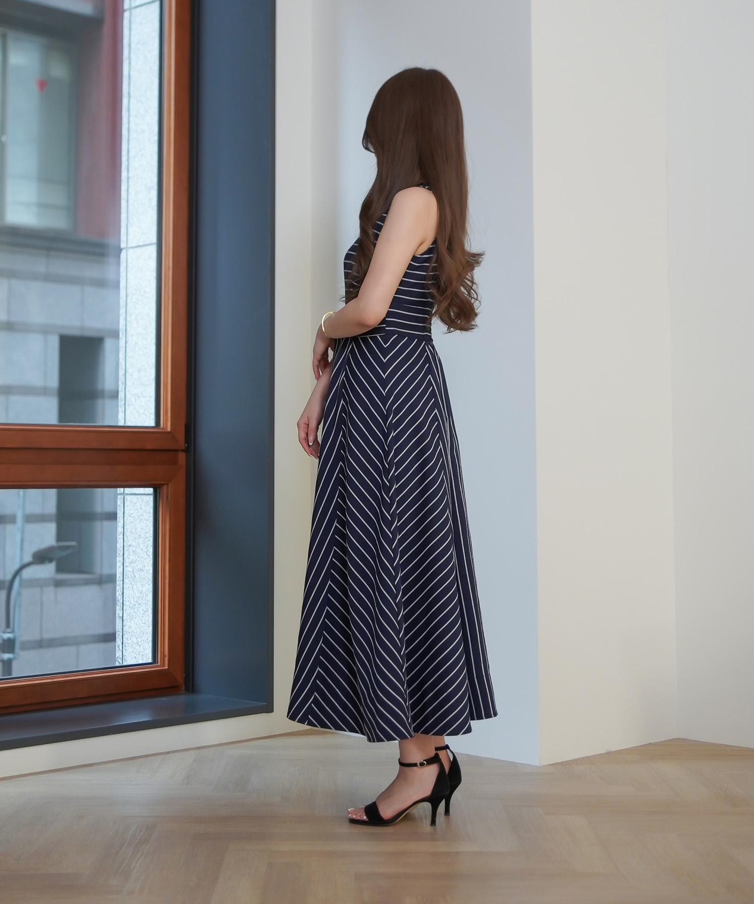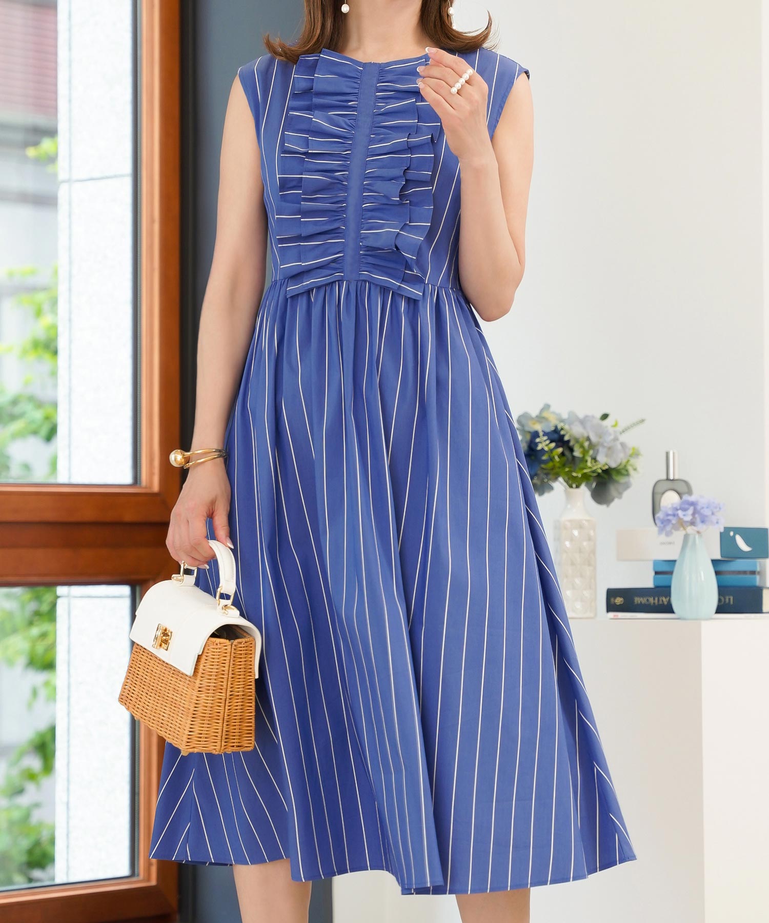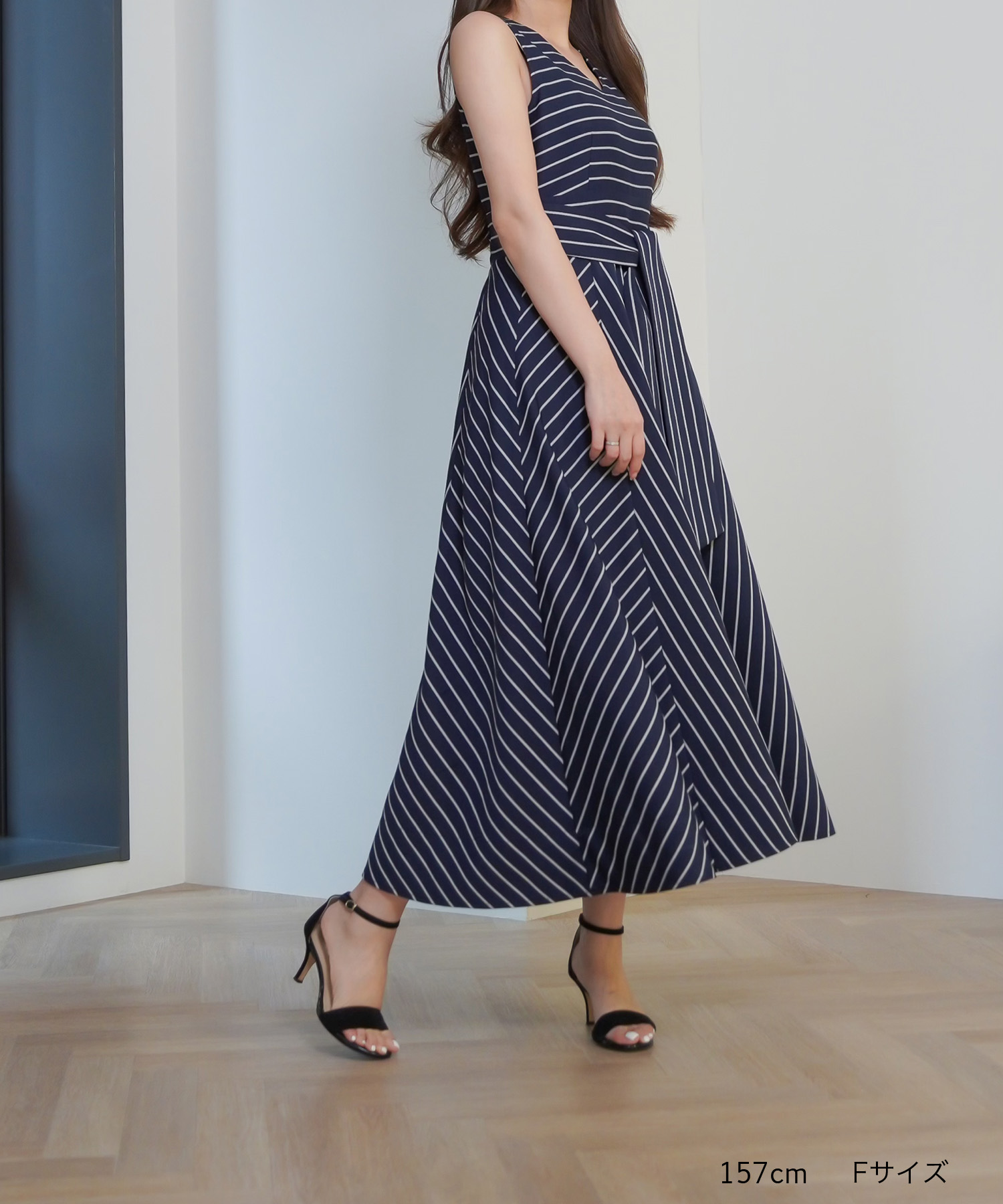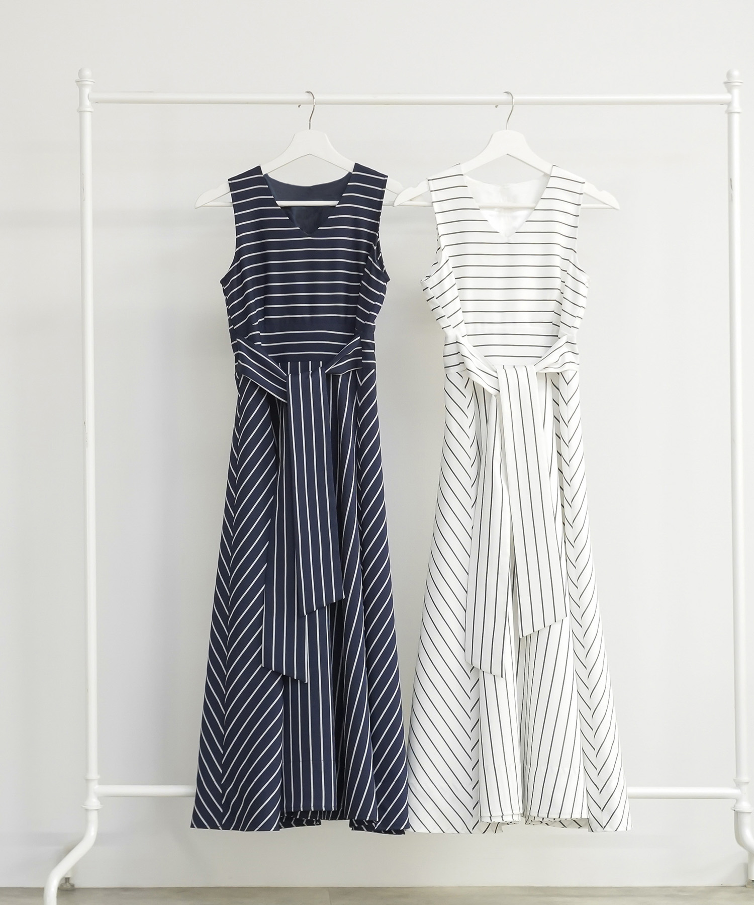 適度な張り感としなやかさを持つストライプ生地を使用した、上品な印象のワンピース。ふんわりと広がるフレアシルエットに、ウエストリボンをプラスして、すっきりとしたラインを演出します。一枚での着用はもちろん、日焼け対策にカーディガンを肩掛けしたスタイルもおすすめです。