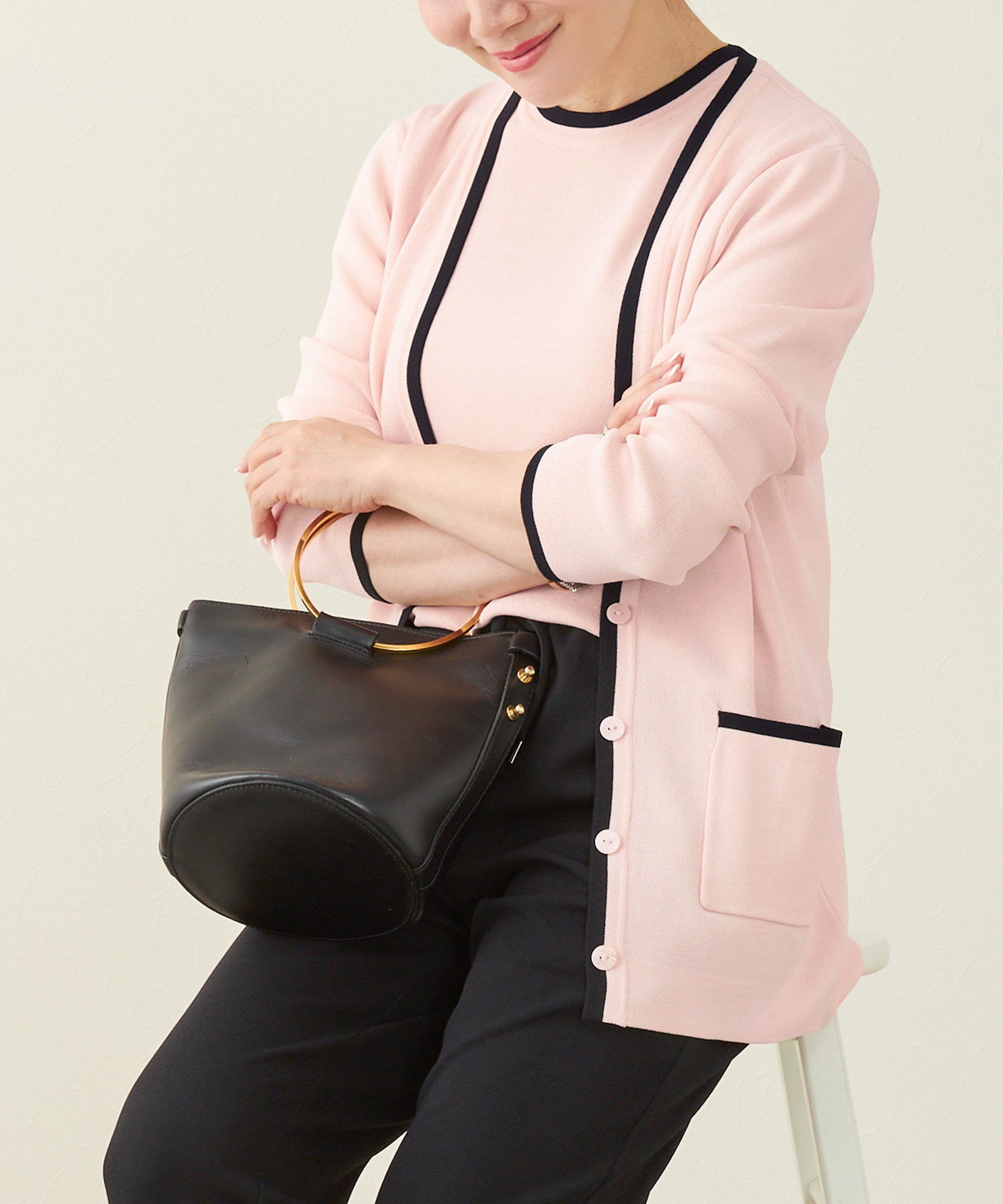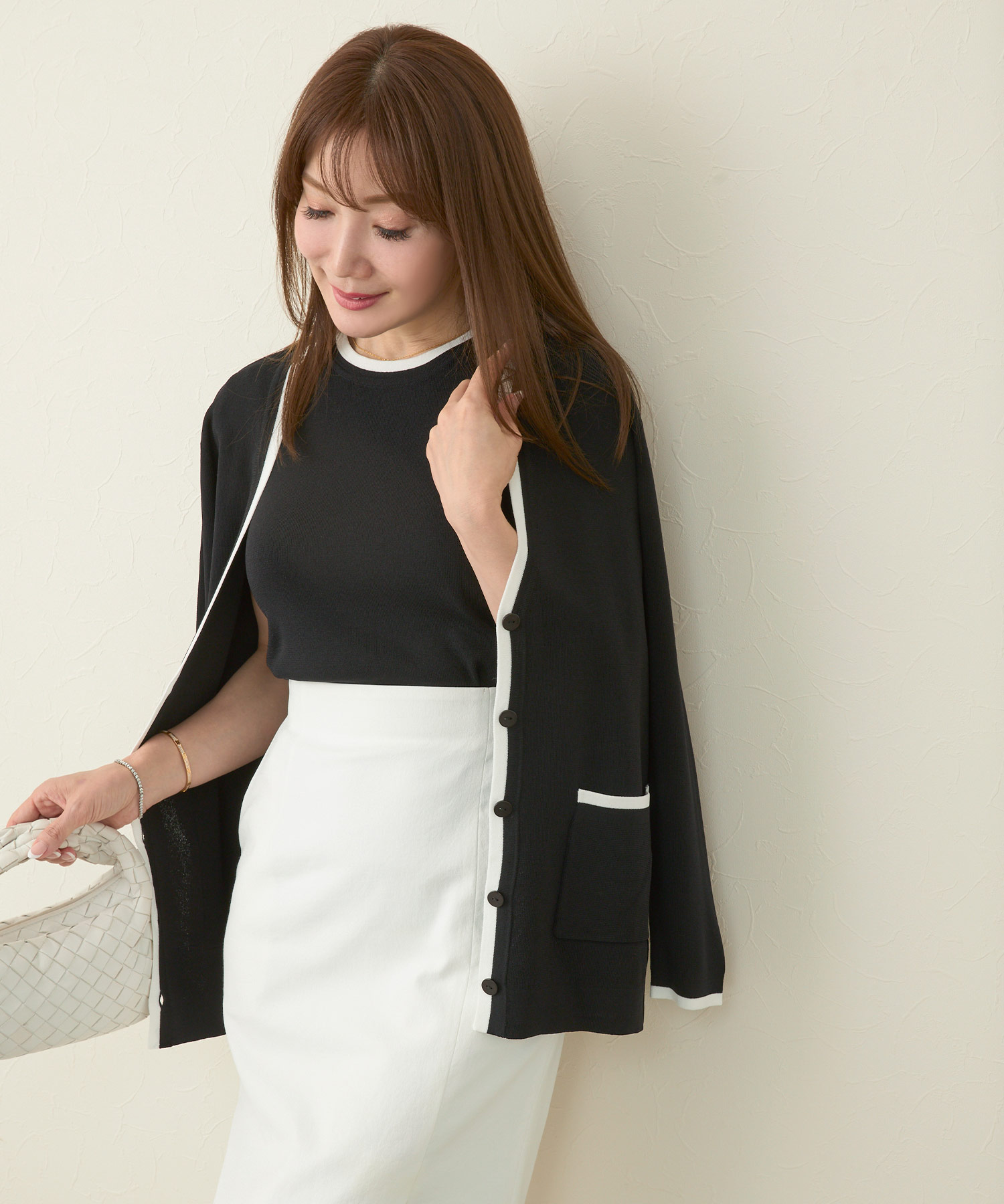 春のコーディネートにぴったりな、赤ラインがアクセントのバイカラーカーディガン。インナーとのセットで、着るだけで洗練されたスタイルが完成します。暖かくなったら、別々に着るのもおすすめ。オフィスでも映える上品なアンサンブルで、春らしい差し色を取り入れて。