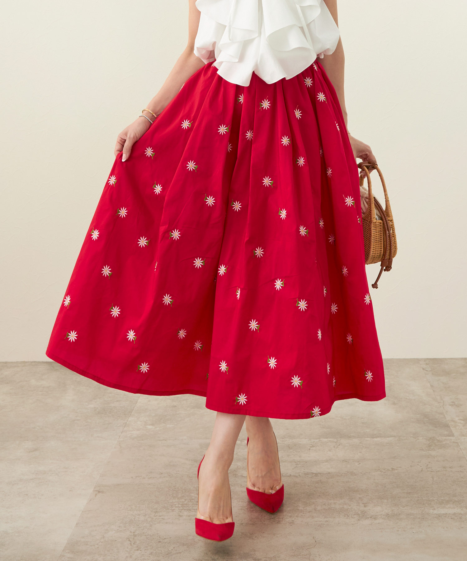 マーガレット刺繍が施された赤いスカートは、女子会やお出かけにぴったりの一枚。適度な張りと艶感のある素材がふんわりとしたシルエットを保ち、動くたびに華やかさを演出してくれます。同素材のセットアップで揃えれば、さらに洗練されたスタイルが楽しめます。