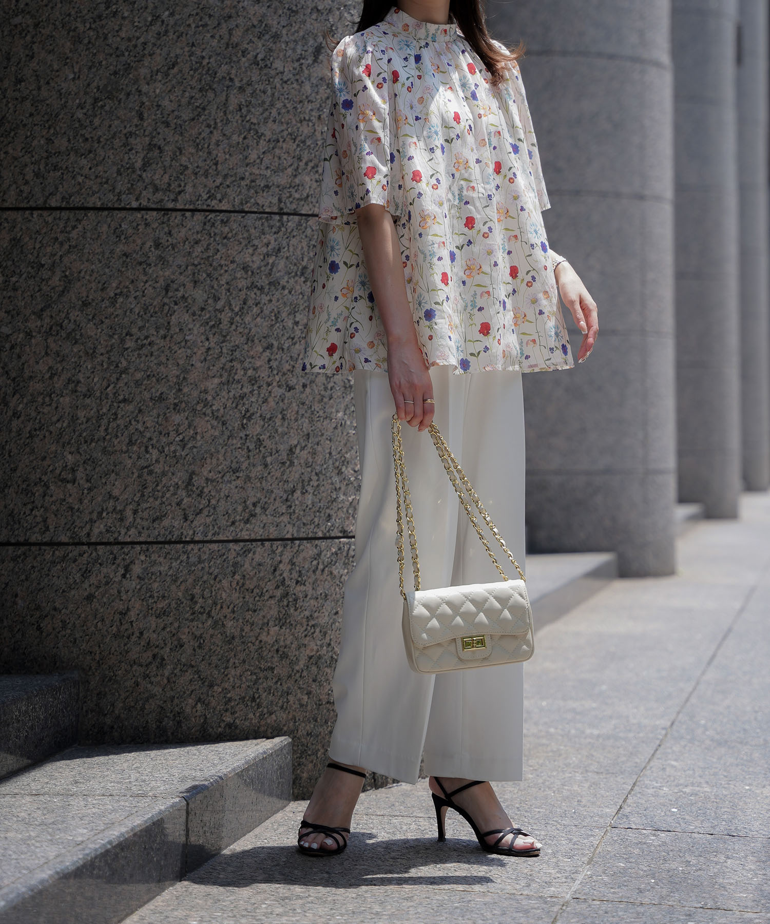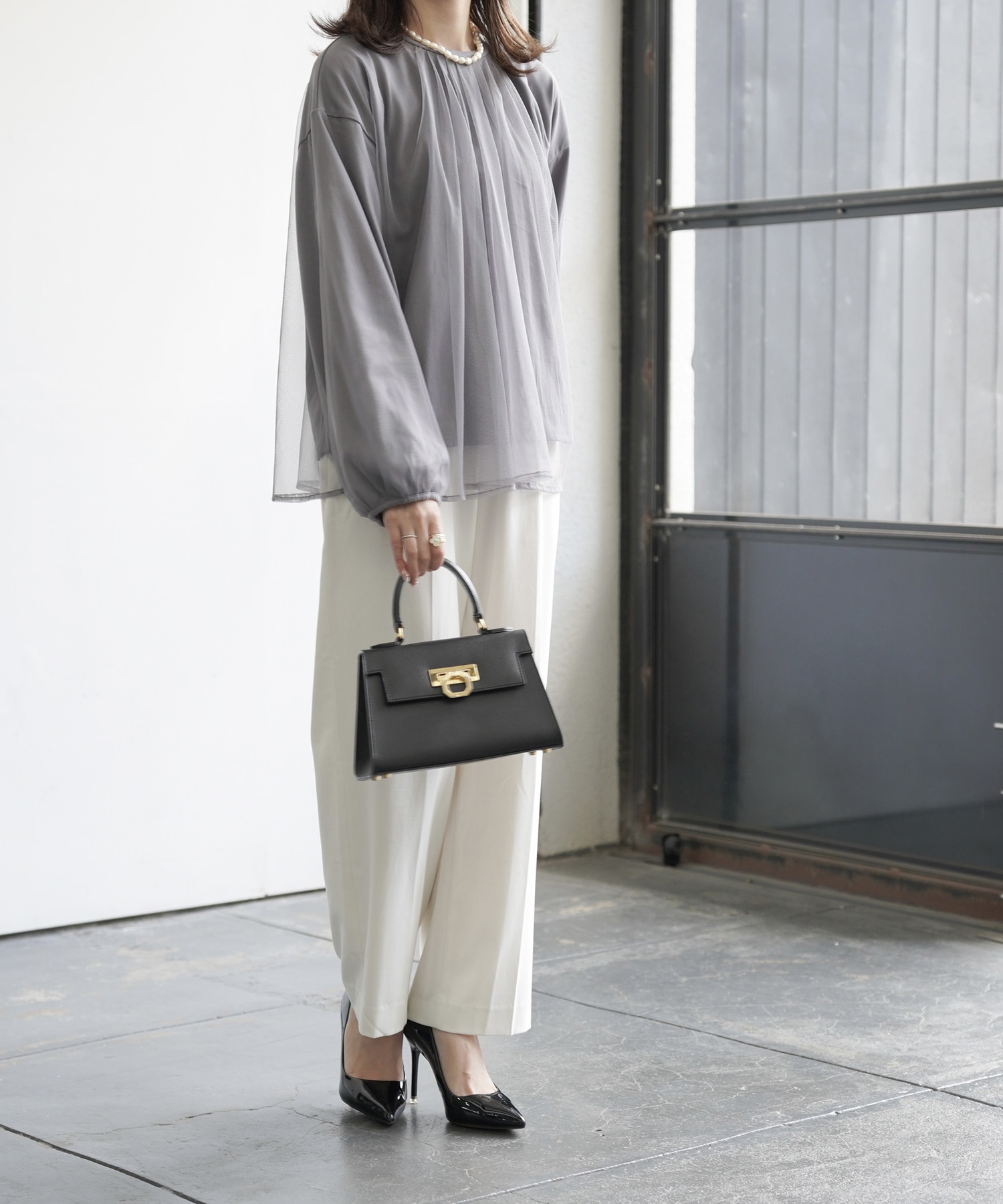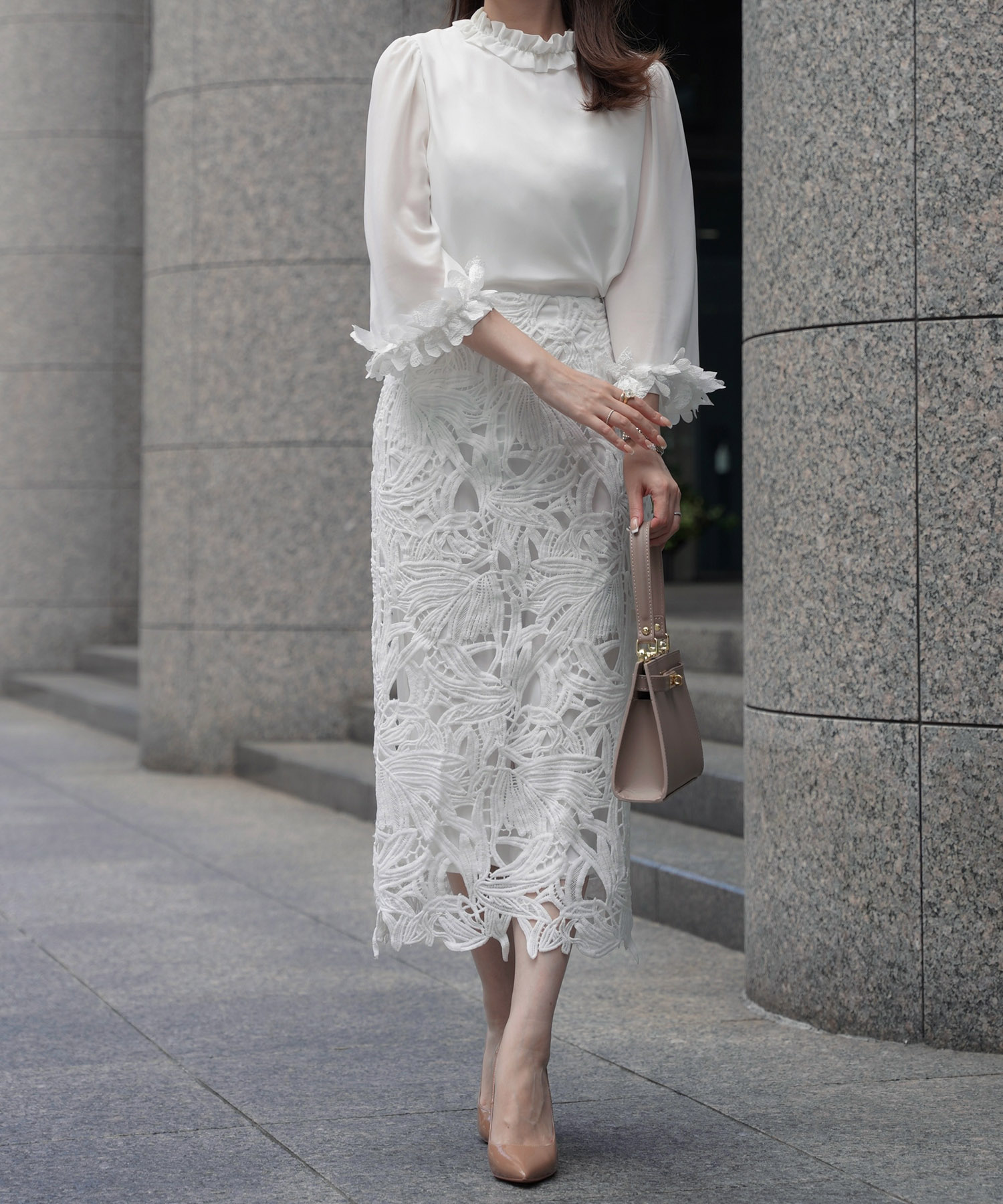 軽やかなシフォン素材を使ったデザインブラウス。袖口に花のようなパーツをあしらい、手元に華やかさを添えています。ピュアなホワイトが春の訪れを感じさせ、シンプルながら洗練された印象に仕上げます。