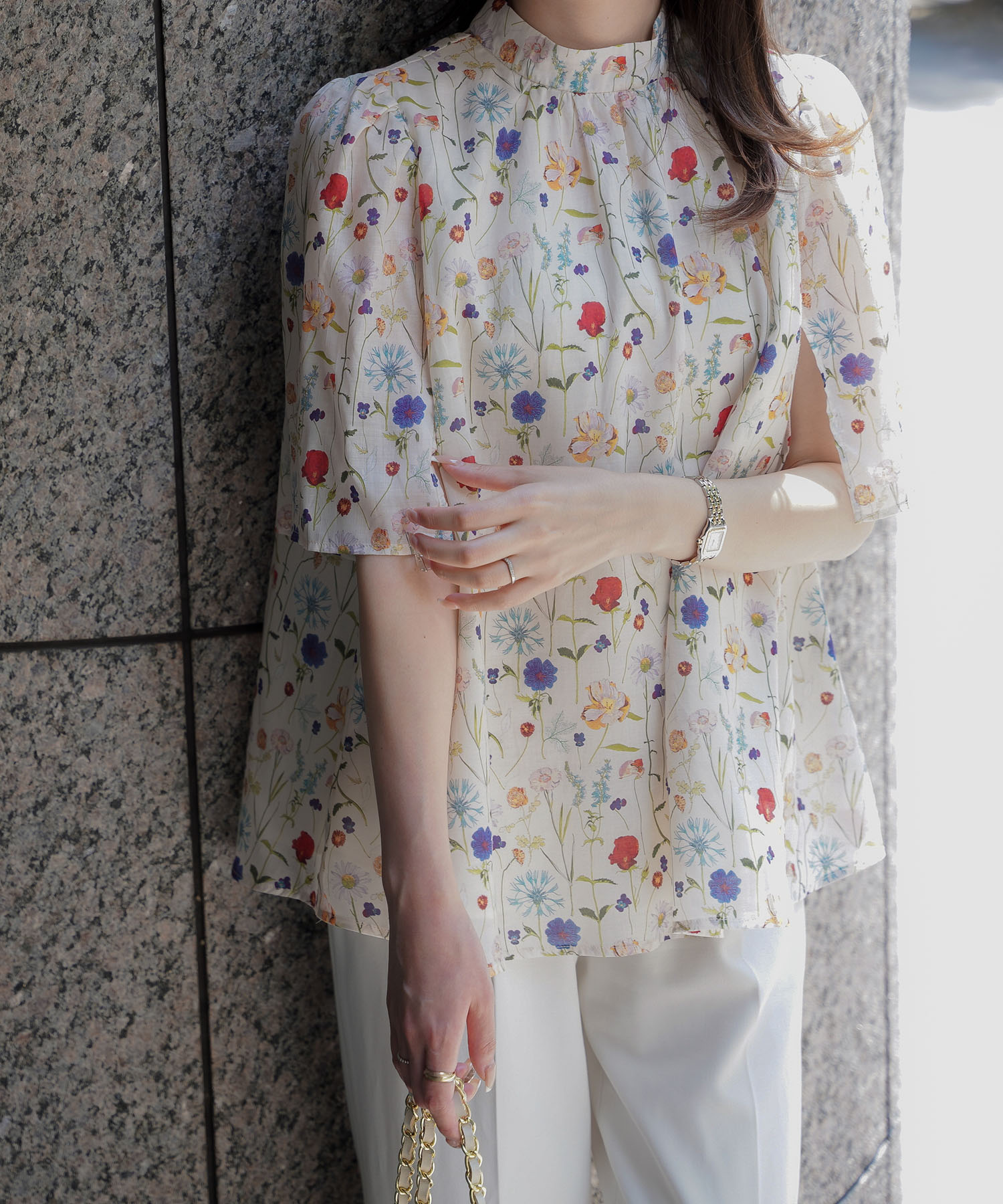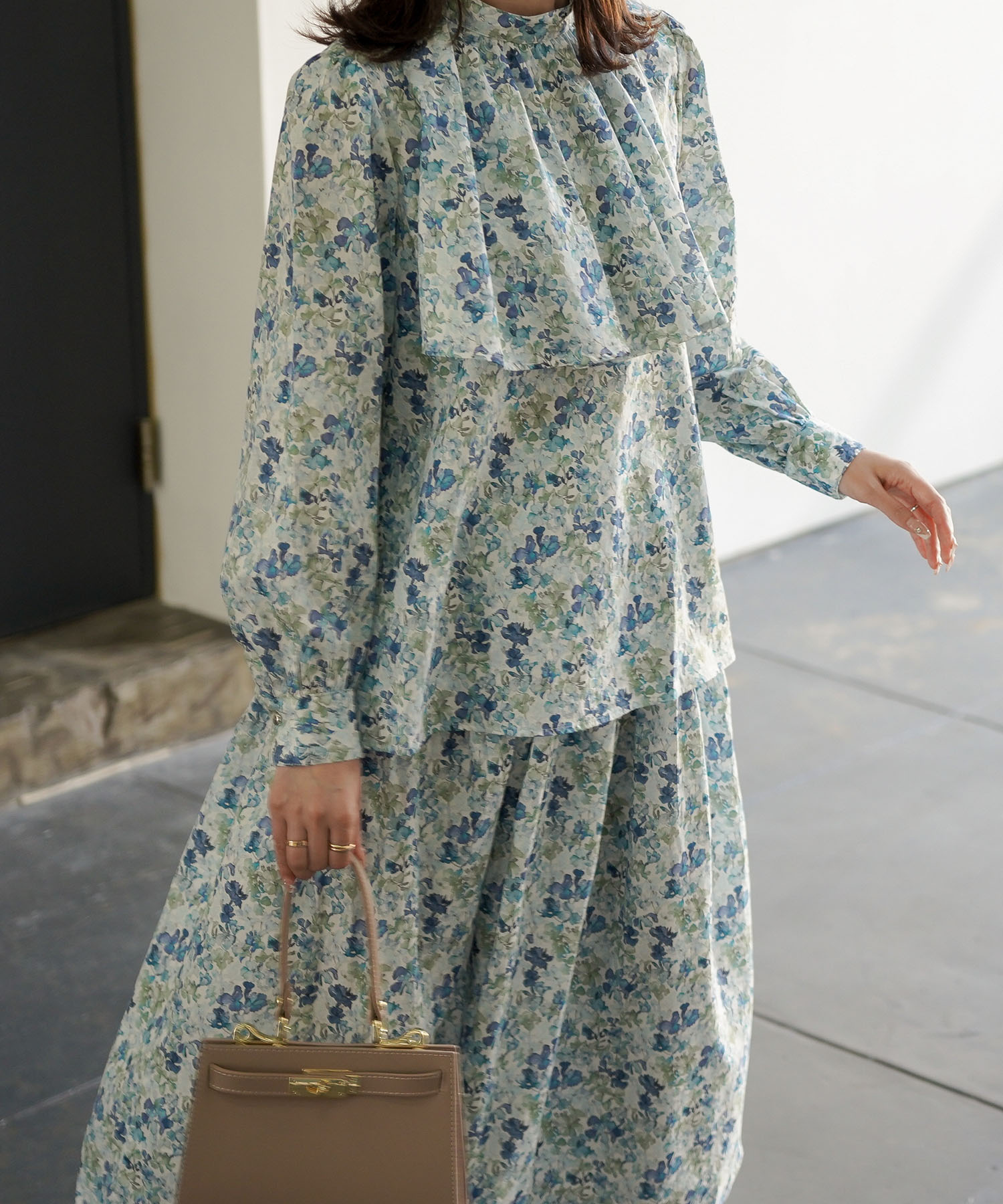 人気のリバティ花柄を、ブラウスとスカートのセットアップで楽しめるアイテム。ケープ風のクラシカルなデザインが、甘さを抑えて大人っぽく仕上げます。柔らかな水彩タッチの花柄が、春の装いにぴったりな華やかさをプラスします。
