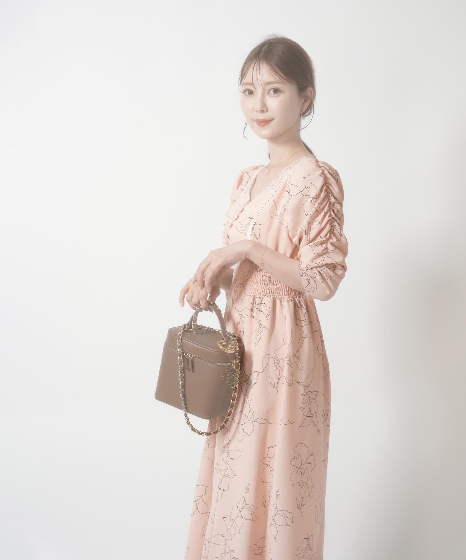 シックな線画調ピンク花柄ワンピースで甘さを引き立てる大人コーデ