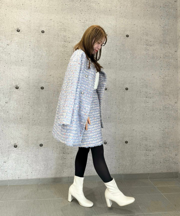 パステルブルーのミックスツイードで作る洗練きれいめコートスタイル