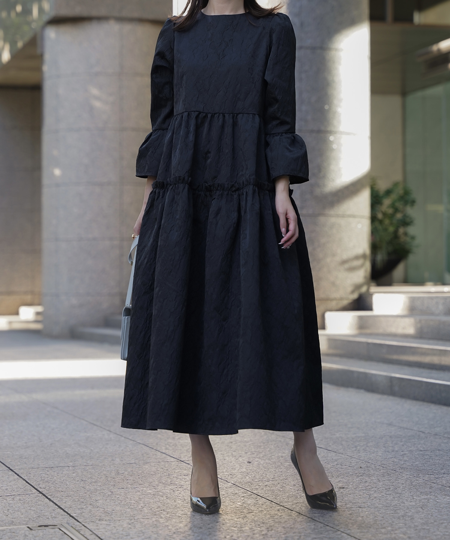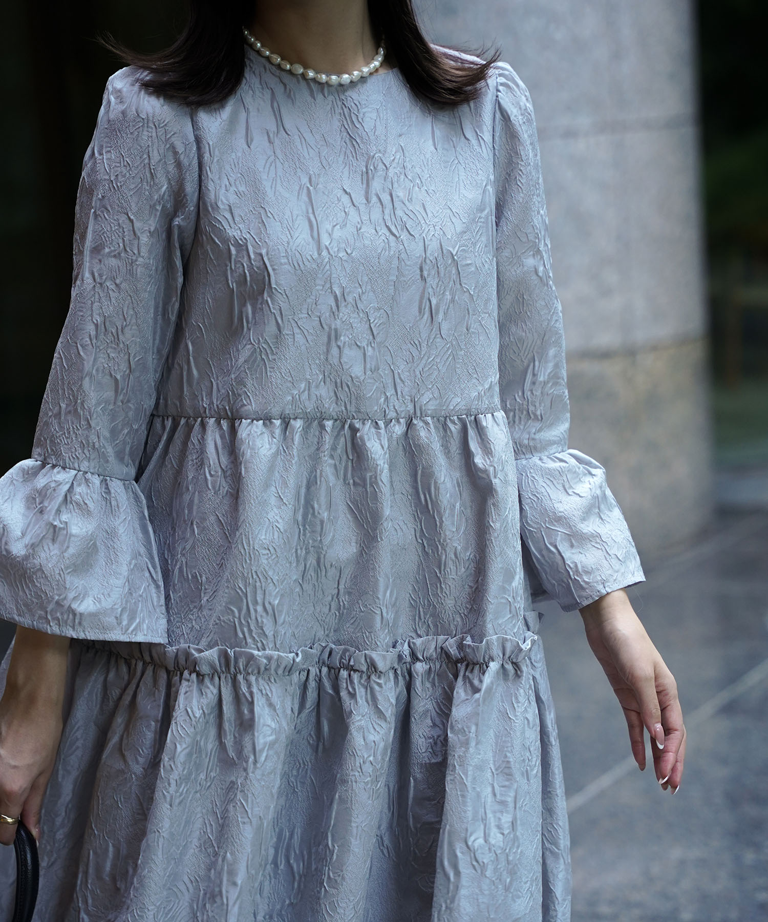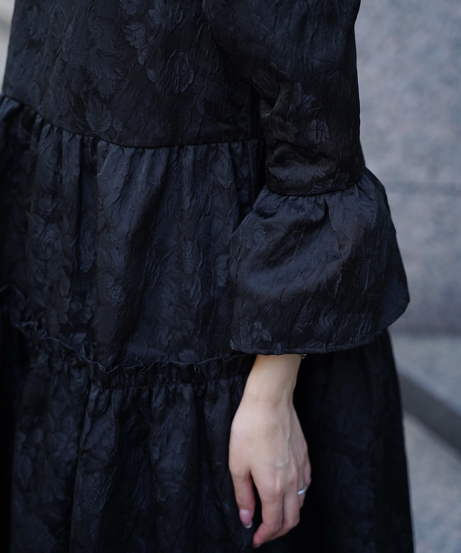 高級感漂うジャガード素材を贅沢に使用した華やかな一枚。ティアードシルエットやベルスリーブなど、エレガントで女性らしいディテールが魅力的。着るだけで気分が上がり、食事会などお洒落なシーンにぴったりなアイテムです。