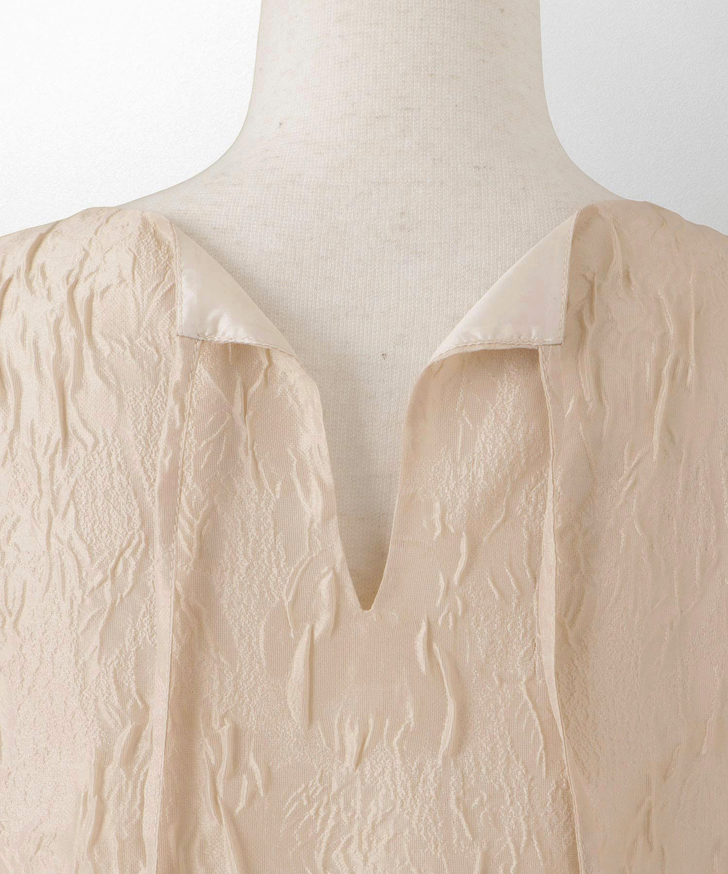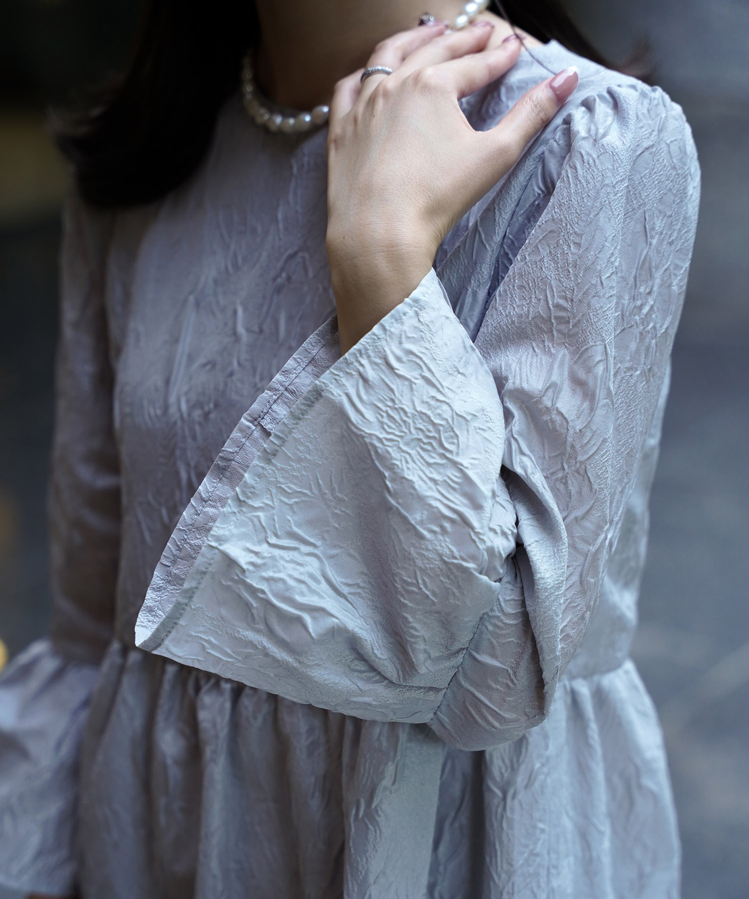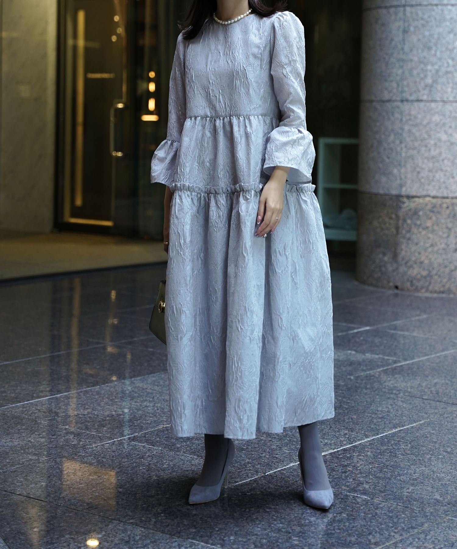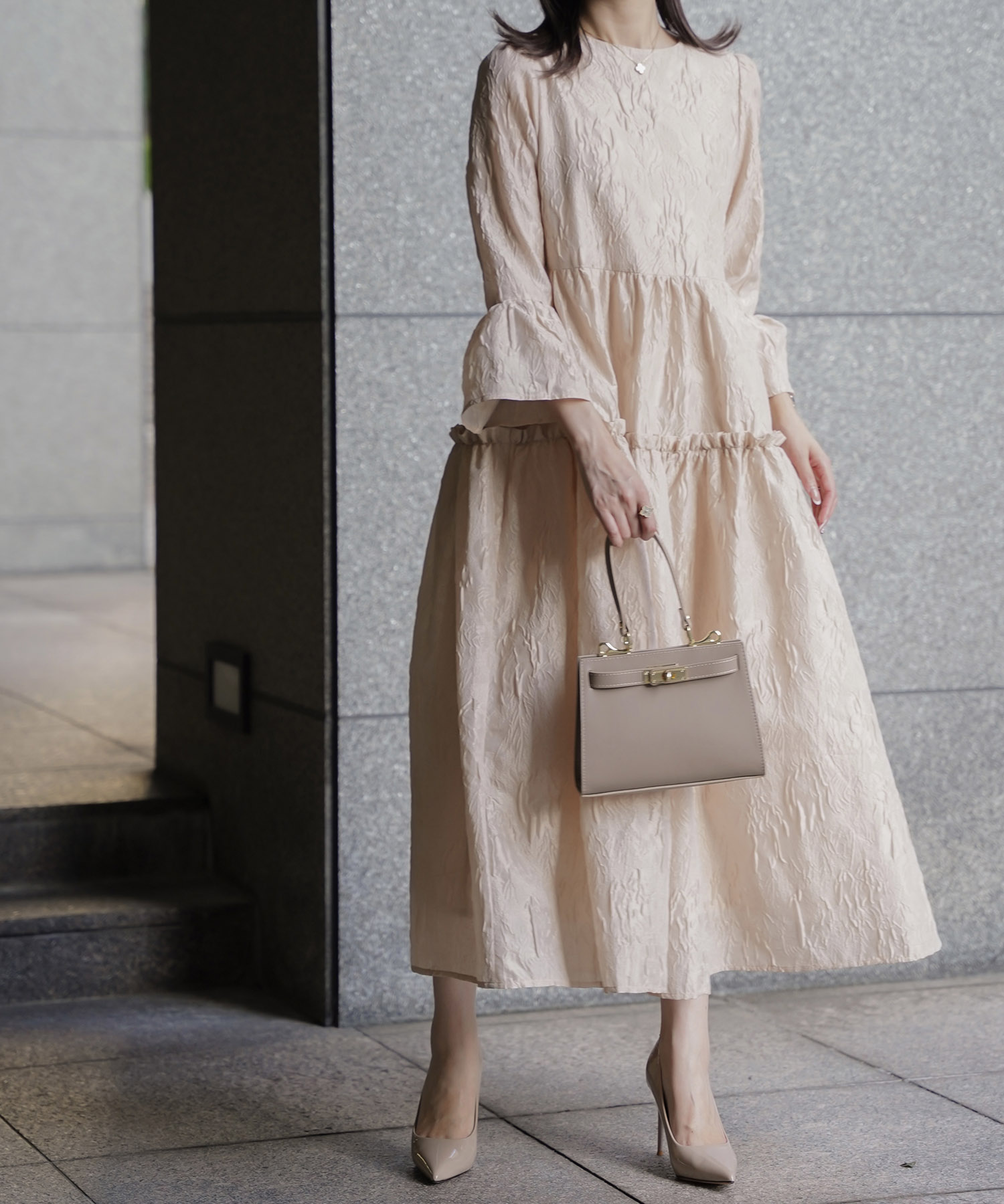 高級感漂うジャガード素材を贅沢に使用した華やかな一枚。ティアードシルエットやベルスリーブなど、エレガントで女性らしいディテールが魅力的。着るだけで気分が上がり、食事会などお洒落なシーンにぴったりなアイテムです。