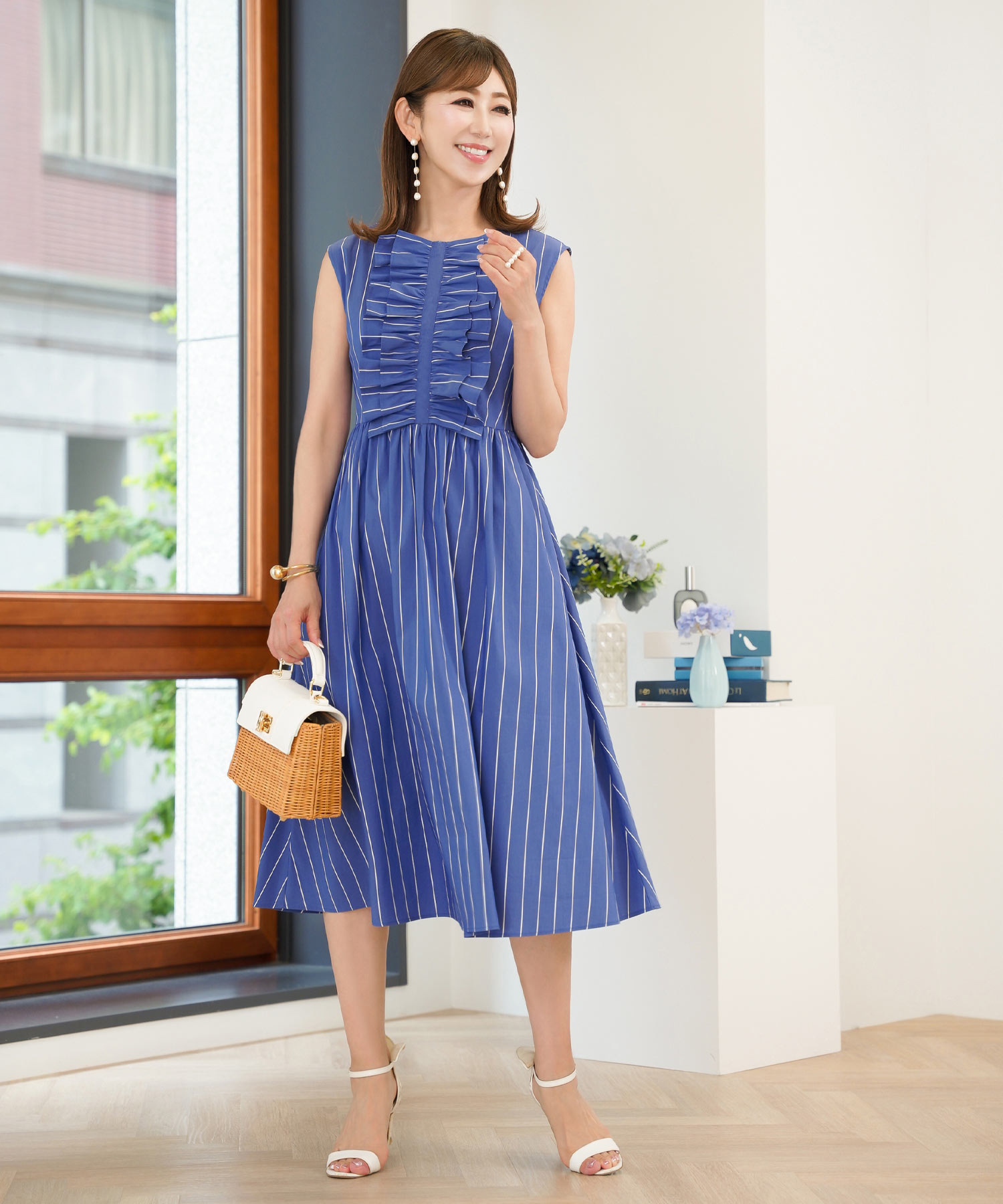 フリル付きストライプワンピースでシンプルな日常に華を添えて