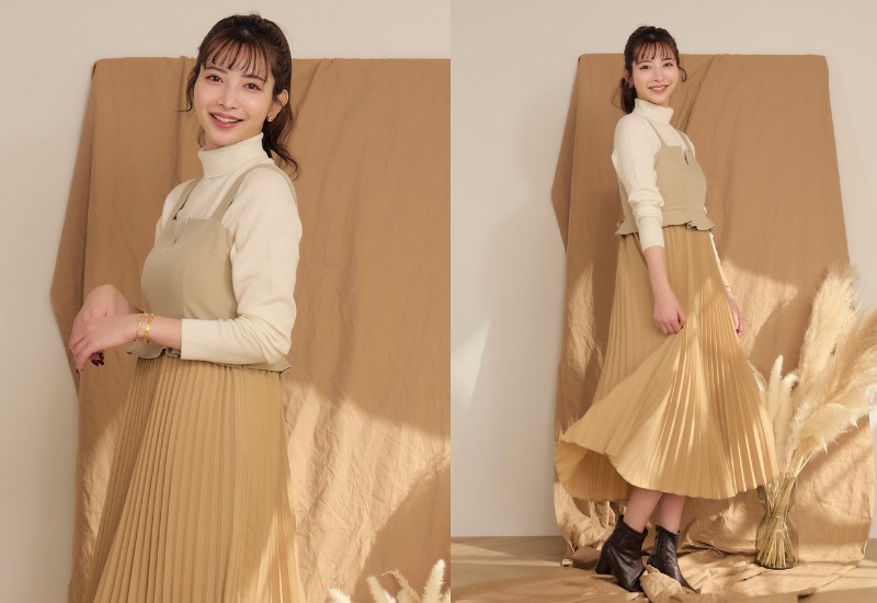 リブやプリーツ、ファー、レザーなど、異なる素材をミックスしたベージュのワントーンコーデ。素材を重ねることで単調にならず洗練された着こなしに。今季大人気だったジレはマニッシュなアイテムですがプリーツスカートと合わせることでフェミニンに仕上がります。