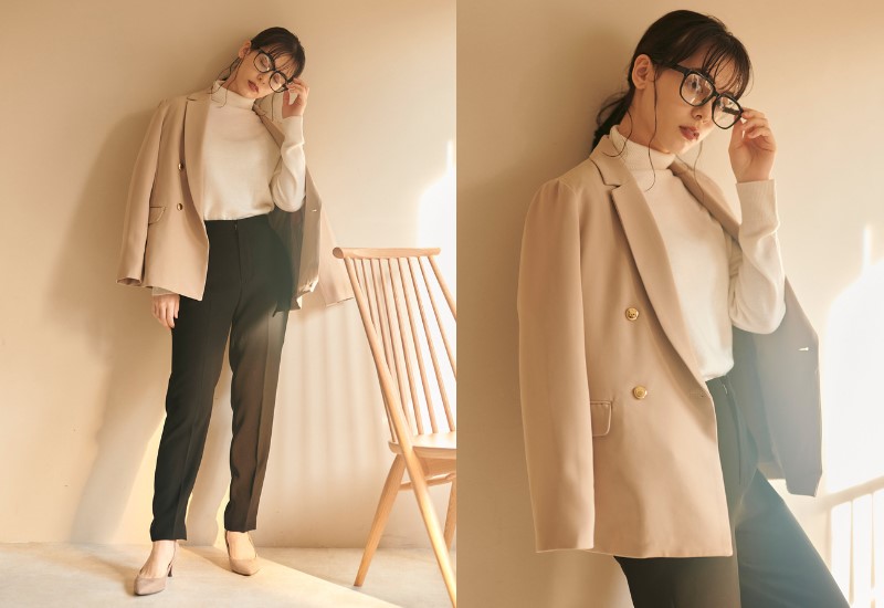 マニッシュなダブルジャケットもベージュならやわらかい仕上がりに。通勤スタイルに使いやすいシンプルなデザインで、さらにインナーを季節別に冬ならハイゲージニット、春ならTシャツと着回していくことでシーズンレスに取り入れることが可能です。ボトムはブラックで引き締めて、キレのある通勤コーデを目指しましょう。