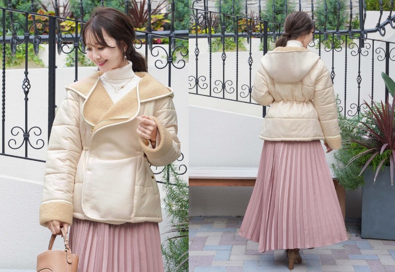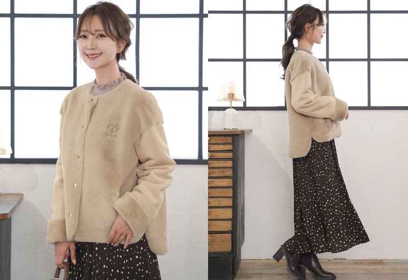 ベージュのアウターに落ち感スカートを合わせたフェミニンなスタイル。アウターはフェイクファーとムートン素材でできているため、リッチ感があり品よくまとまります。襟はノーカラーになっているのでインナーにフリルネックをチラ見せして、細部までおしゃれを楽しんで♪