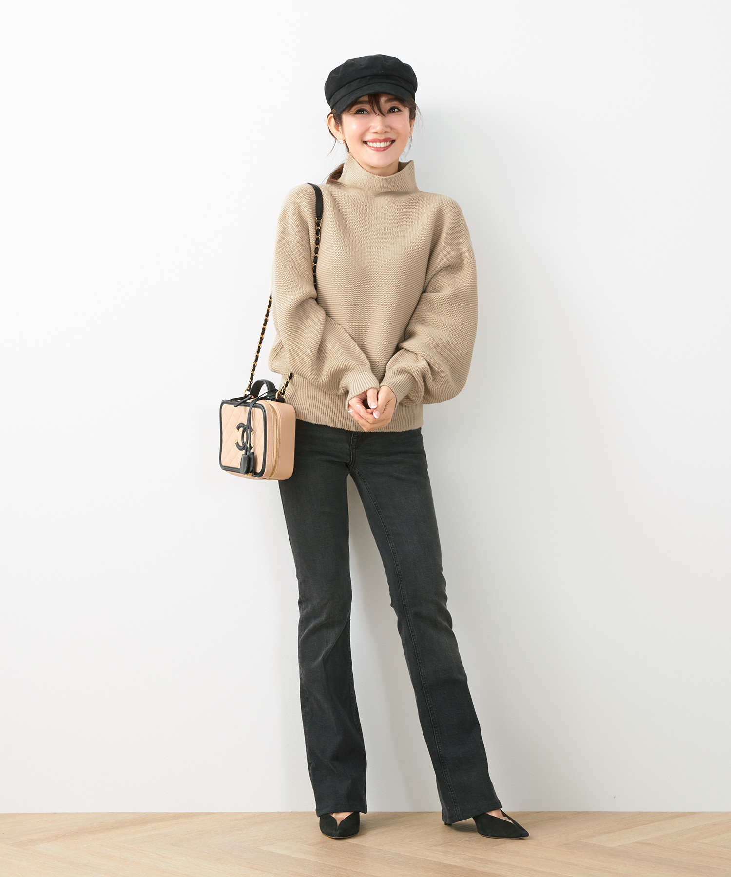 ブラックデニムにベージュのニットをあわせたコーデならカジュアルスタイルがシックに昇華。デニムは細身を選ぶことでオーバーサイズのニットともギャップが生まれ、女性らしさを演出します。さらに足元はデニム同色のパンプスをチョイスしてきれいめに振って。