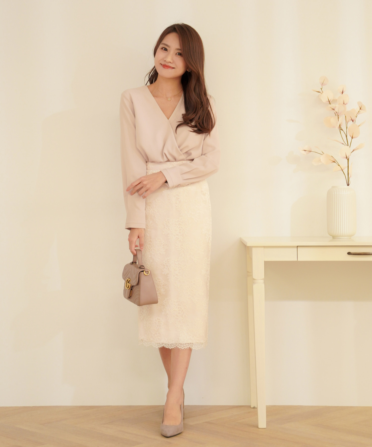 きれいめ通勤スタイルにあると便利なベージュのとろみブラウス。きちんと感がありやわらかい雰囲気に仕上がるので商談の日にあわせたい一枚です。パンツでもスカートでも合わせやすいシンプルな形で着回しやすいところもポイント。白のタイトスカートとスタイリングして爽やかさもプラスして。