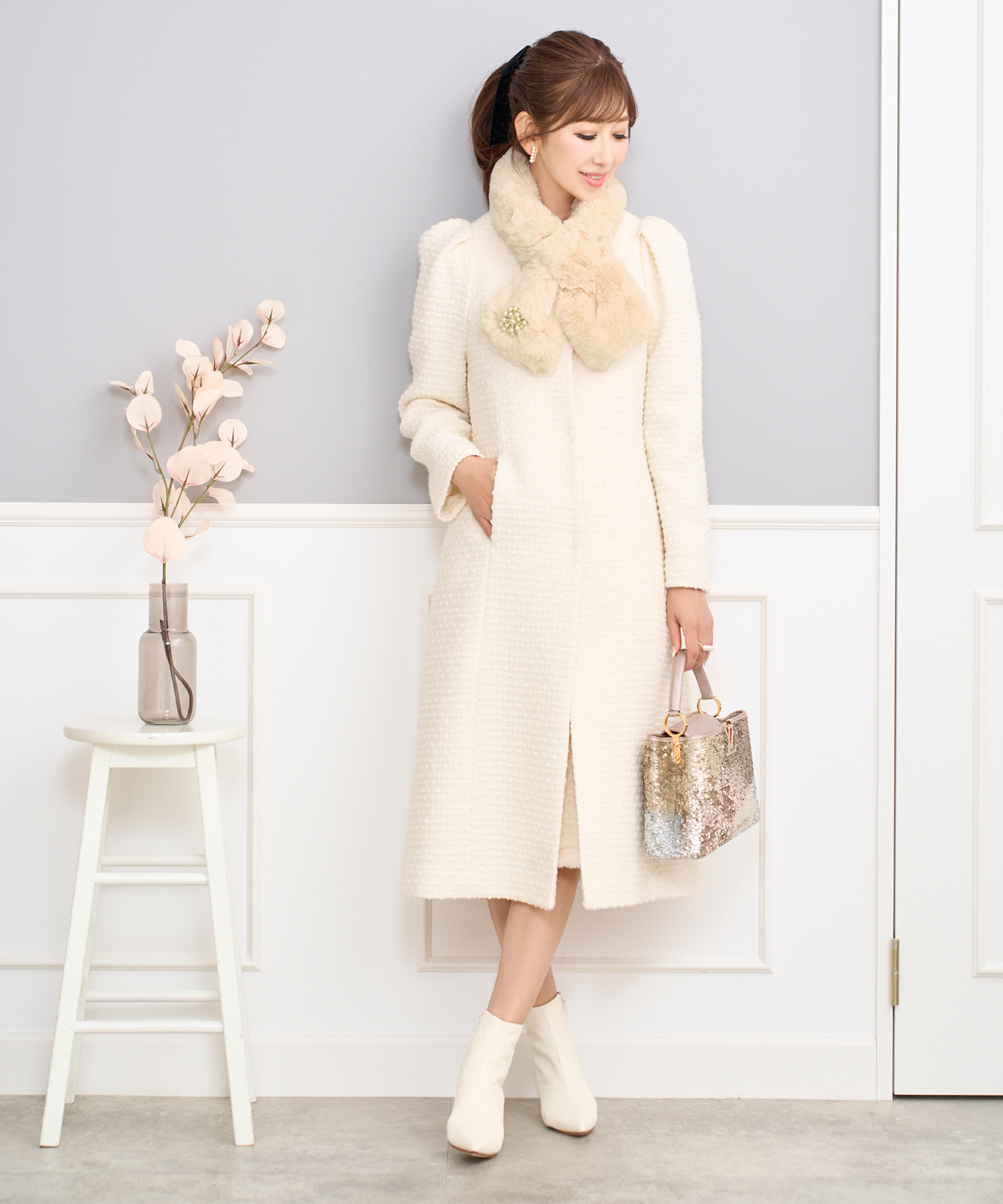 ホテルでの会食がある日はツイードアウターとフェイクファーのティペットを合わせてリッチにまとめたコーディネートがおすすめ。さらにコーディネートにパールのブローチやスパンコールのバッグを足すことで華やかさがアップし、おしゃれで上品なスタイルに。ツヤのあるブローチやスパンコールのバッグをさりげなく散りばめてパーティ感をさらに加速させて。