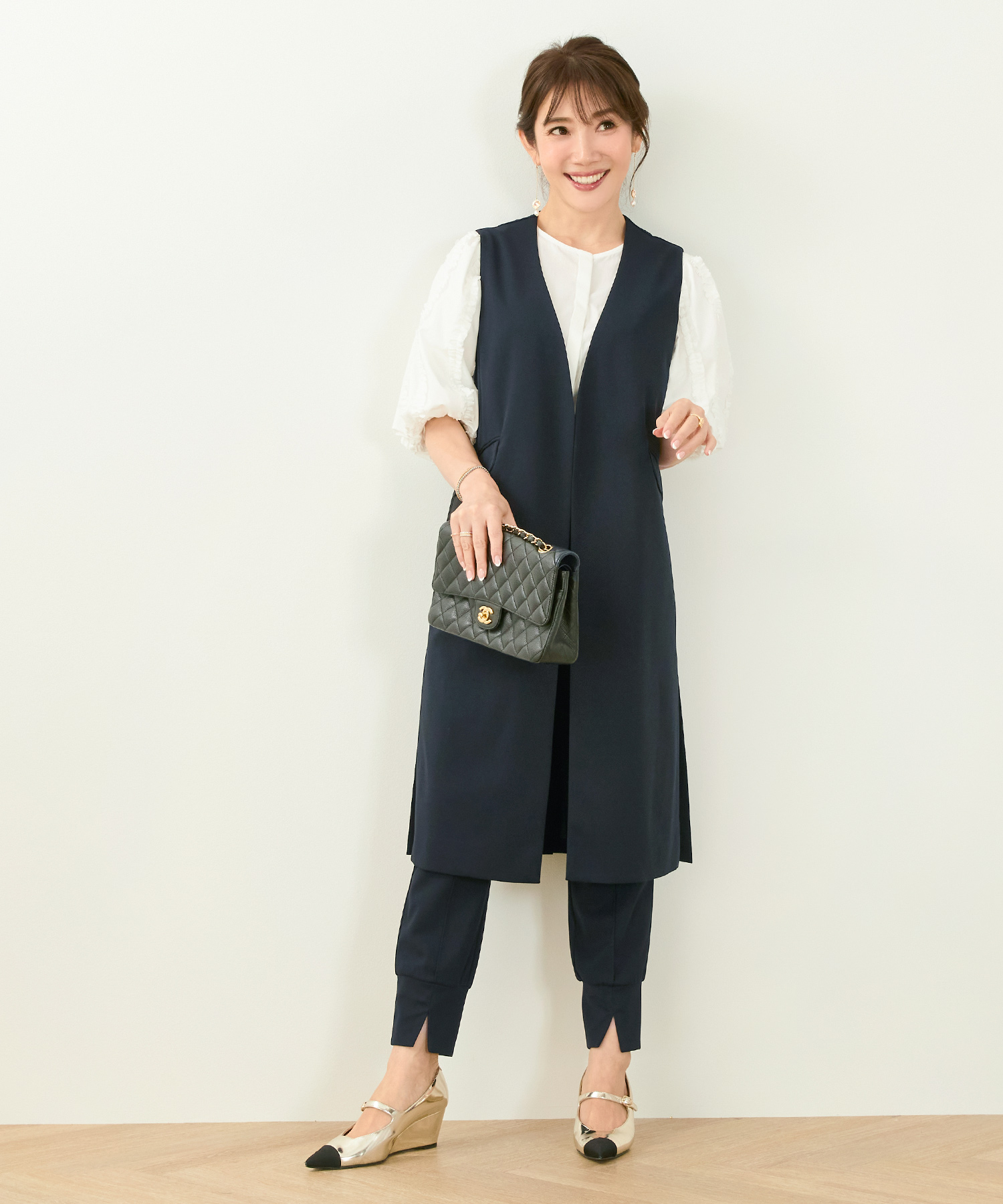 カットジョーゼット素材のジョガーパンツと、同素材のジレを合わせたトレンドコーデ。縦長のラインが全体をすっきりと見せてくれます。ブラウスやTシャツなど、インナー次第で雰囲気を変えられるのもポイントです。