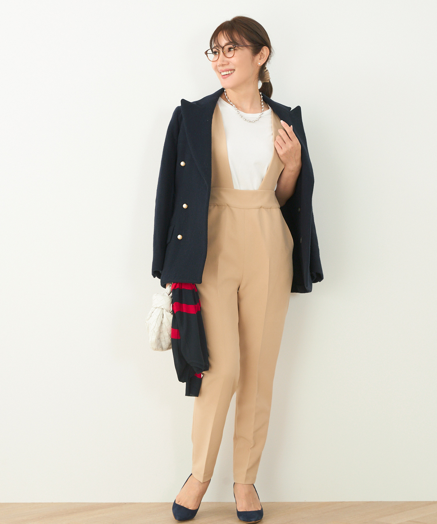 テーパードシルエットのサロペットパンツは、さまざまなアイテムと相性抜群です。冬はニットを重ねてもおしゃれ。マフラーなどの小物で差し色を取り入れるのもおすすめです。