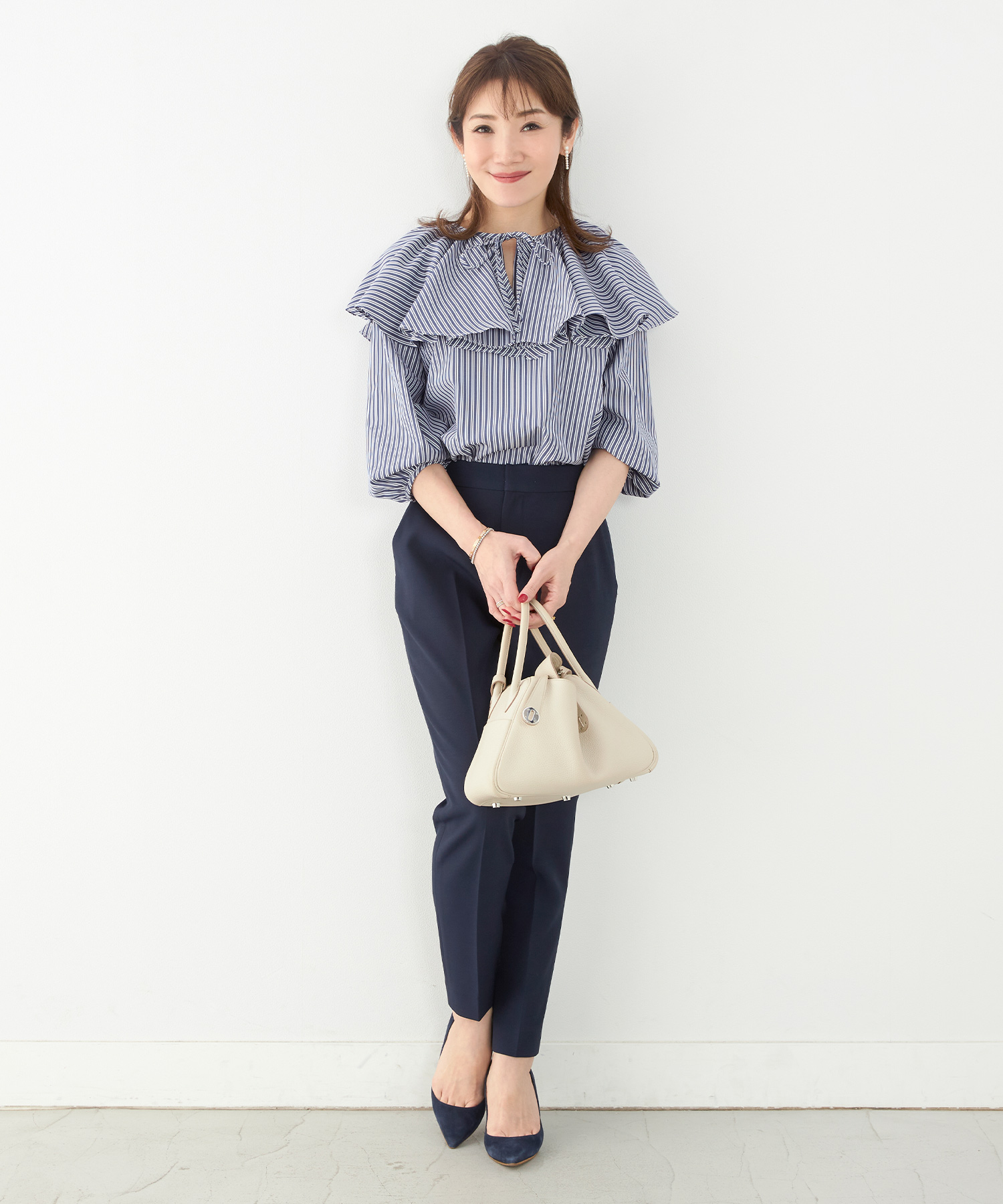 大きなフリルの襟が目をひくブラウスとセンタープレスのパンツコーデです。スリットが入った七分袖のブラウスは、ボリューミーながら抜け感も兼ね備えています。落ち感のあるとろみ素材のパンツを合わせることで、下半身のすっきり見せも叶えられます。