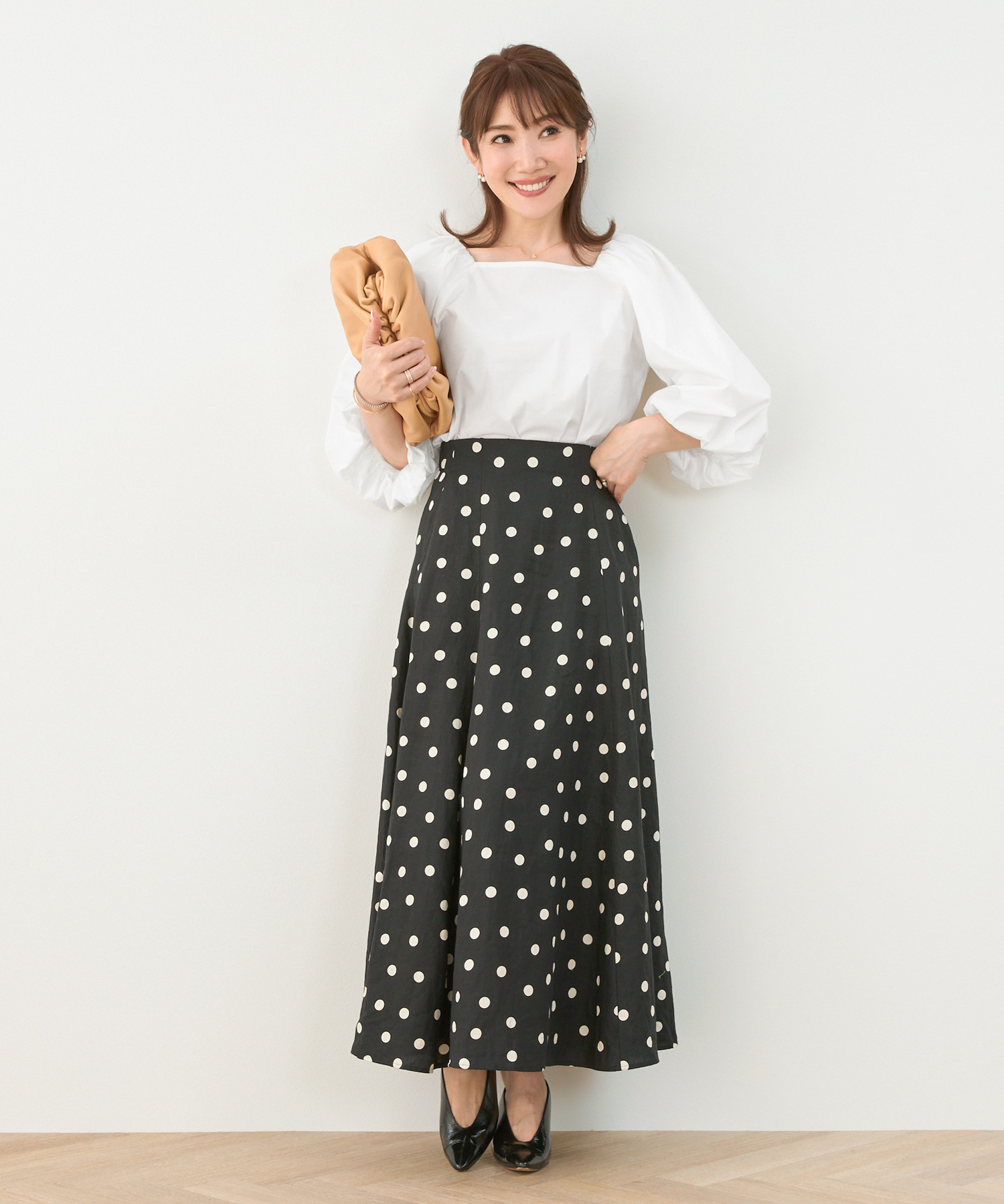 ボリュームのあるバルーンスリーブのブラウスと、ドット柄のタックスカートの組み合わせ。春らしいふんわりとした柔らかさを出しながら、モノトーンで大人びた印象も演出できます。シンプルなデザインのアイテムは着回し力も抜群のため、一つ持っておくと大活躍するはず。
