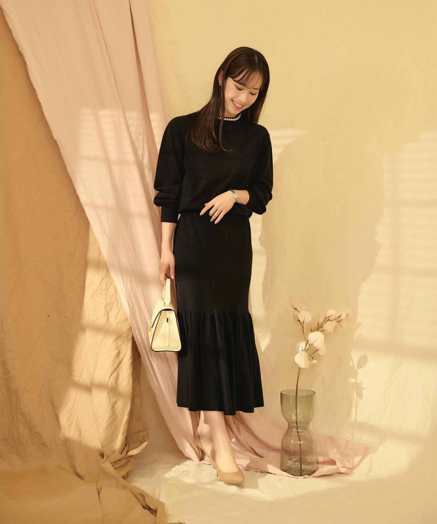 シンプルなハイゲージニットに、同じ素材のロング丈マーメイドスカートを合わせたセットアップ風コーデです。上品な光沢のある生地と首元のパールで、華やかさもアップ。抜け感もありつつ、きちんと感のあるスタイルを見せられます。