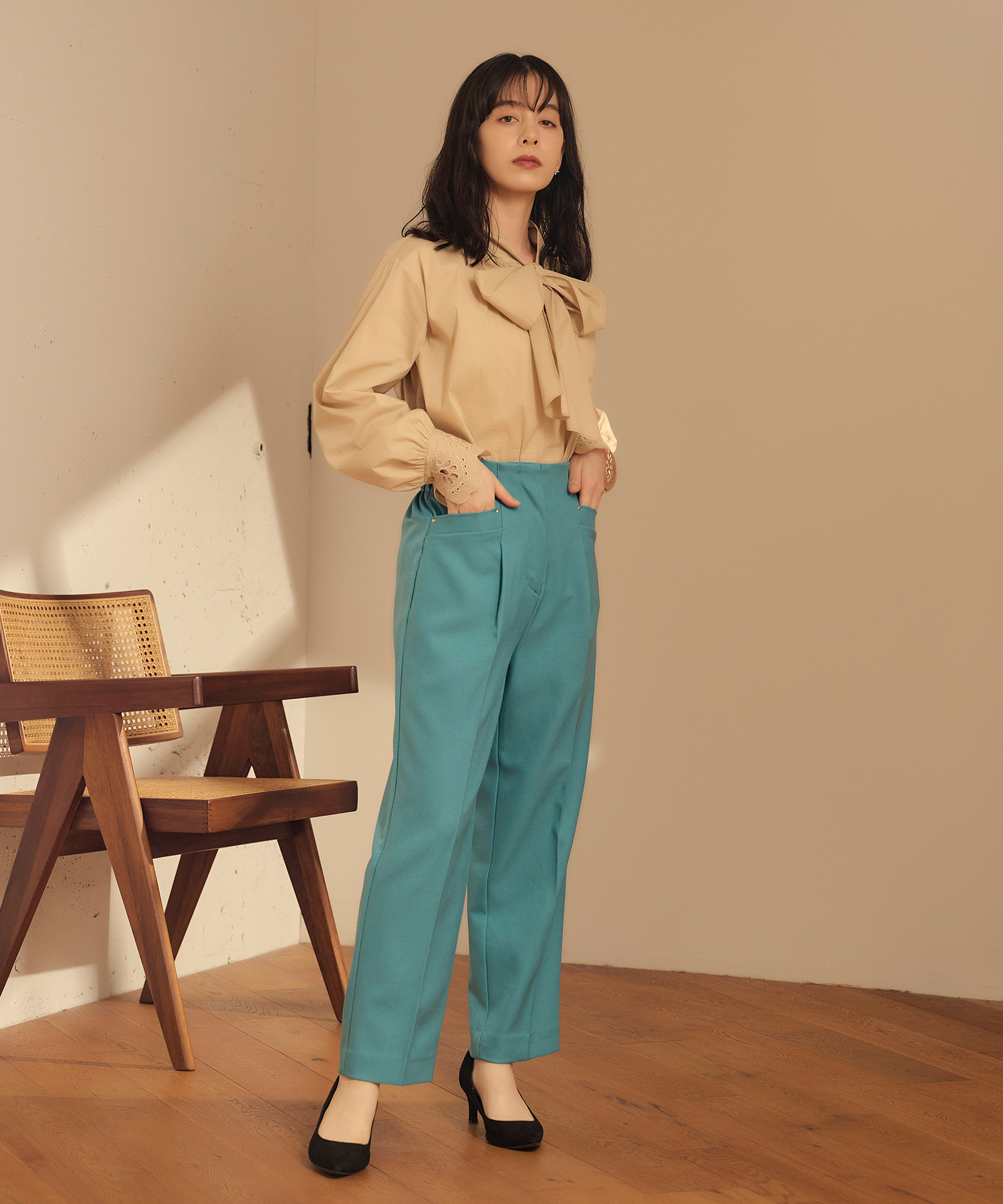 パンツ派:カルゼ素材のハイウエストテーパード×ボウタイブラウスで上品に。クロップド丈テーパードはハイネックやジャケットでクラシカルに。