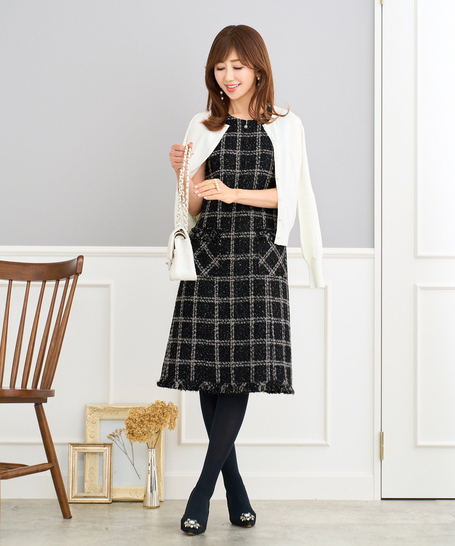 Onepiece:チェックツイード フロントジップ ワンピース<Prima Scherrer>