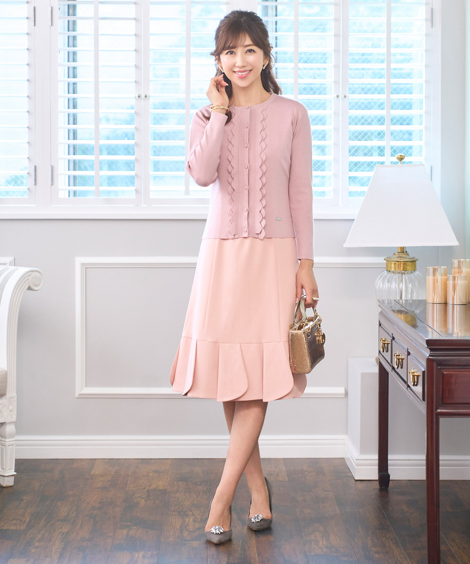 適度なハリと光沢のあるワンピースはエレガントに着こなせます。ハイゲージニットのカーディガンを合わせることで、より大人びた印象に。華やかなペールピンクで統一した、春にぴったりのコーデです。