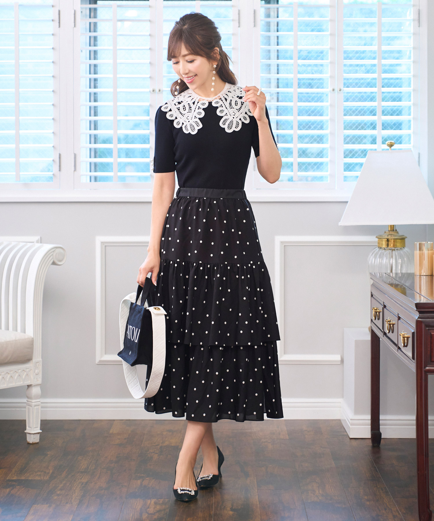 上下ともにブラックでまとめたコーディネートでも、素材や合わせ方次第で軽やかに見せられます。トップスの首元は、レースの襟で繊細さと上品さをプラス。ランダムドットプリントのスカートは、美しいドレープが印象的です。コーデ全体の印象をふんわりとまとめられます。
