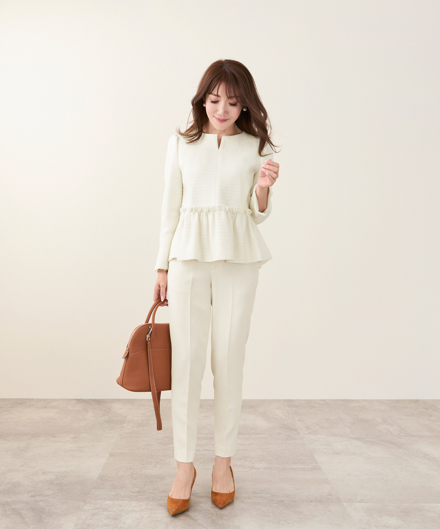 やわらかな春色が好印象。春色トップスでつくる春の授業参観スタイル