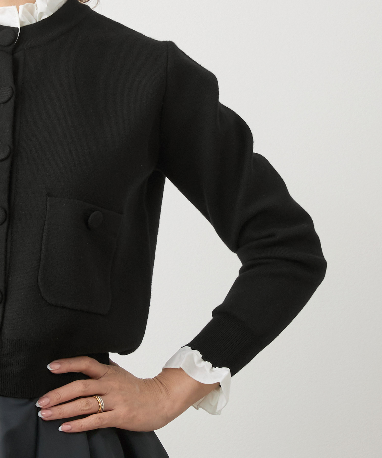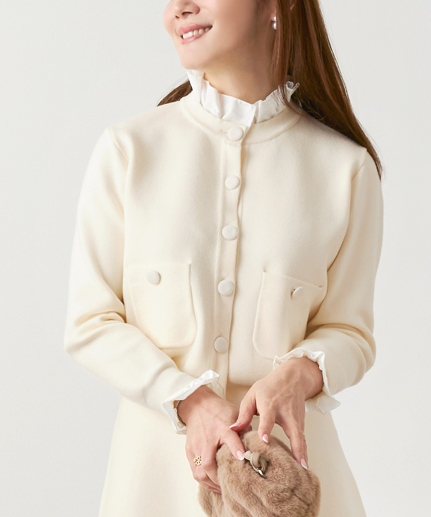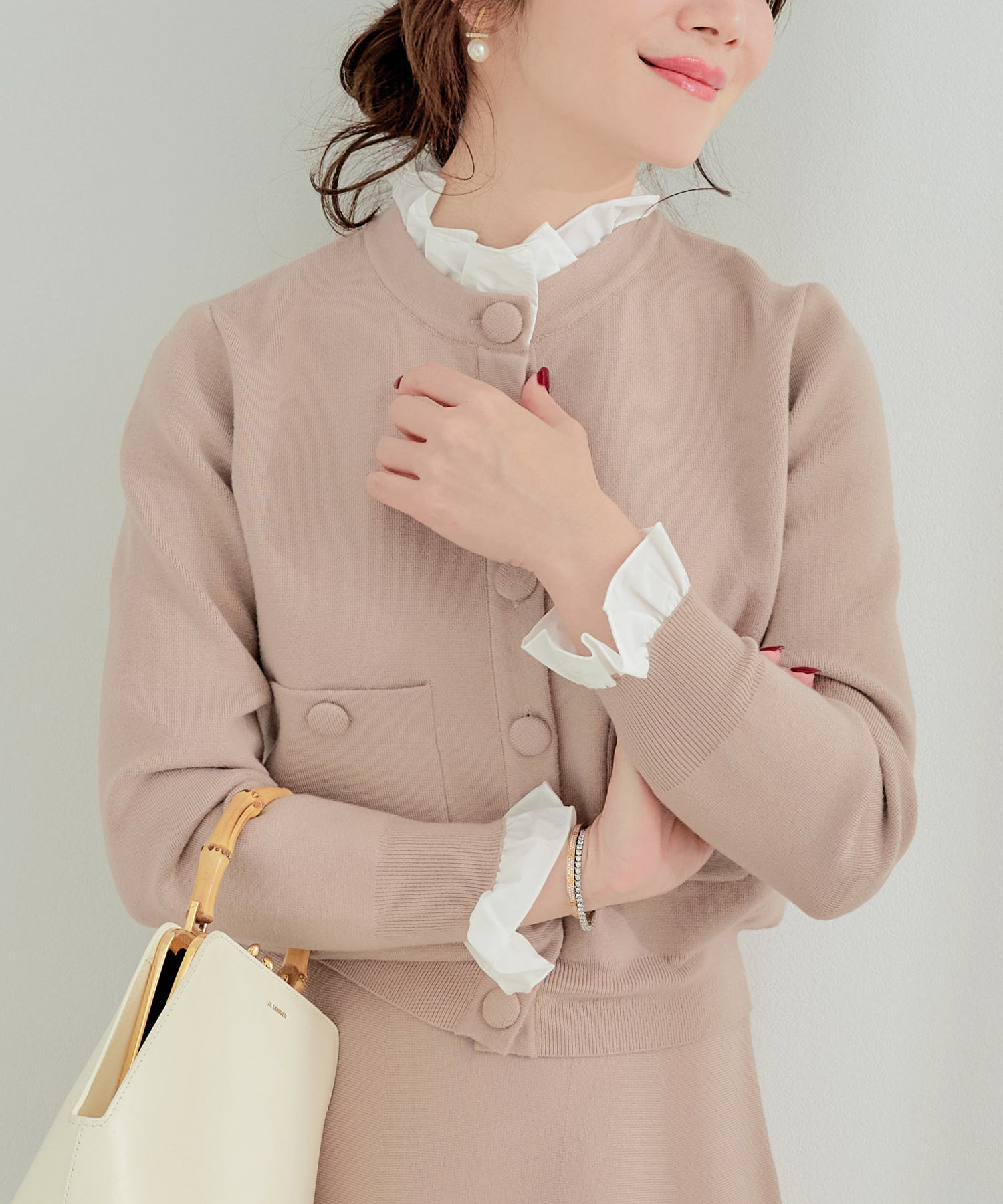 程よく肉厚なミラノリブ素材で、カーディガンながらノーカラージャケットのようなきちんと感を演出。襟元と袖にあしらわれた異素材フリルや、クラシカルなくるみボタンが、冬の授業参観にぴったりの華やかさを添えます。室内外の気温差に対応しやすく、ニットならではの軽やかさと柔らかな着心地も魅力。寒い季節の行事や通勤にも心強い一枚です。