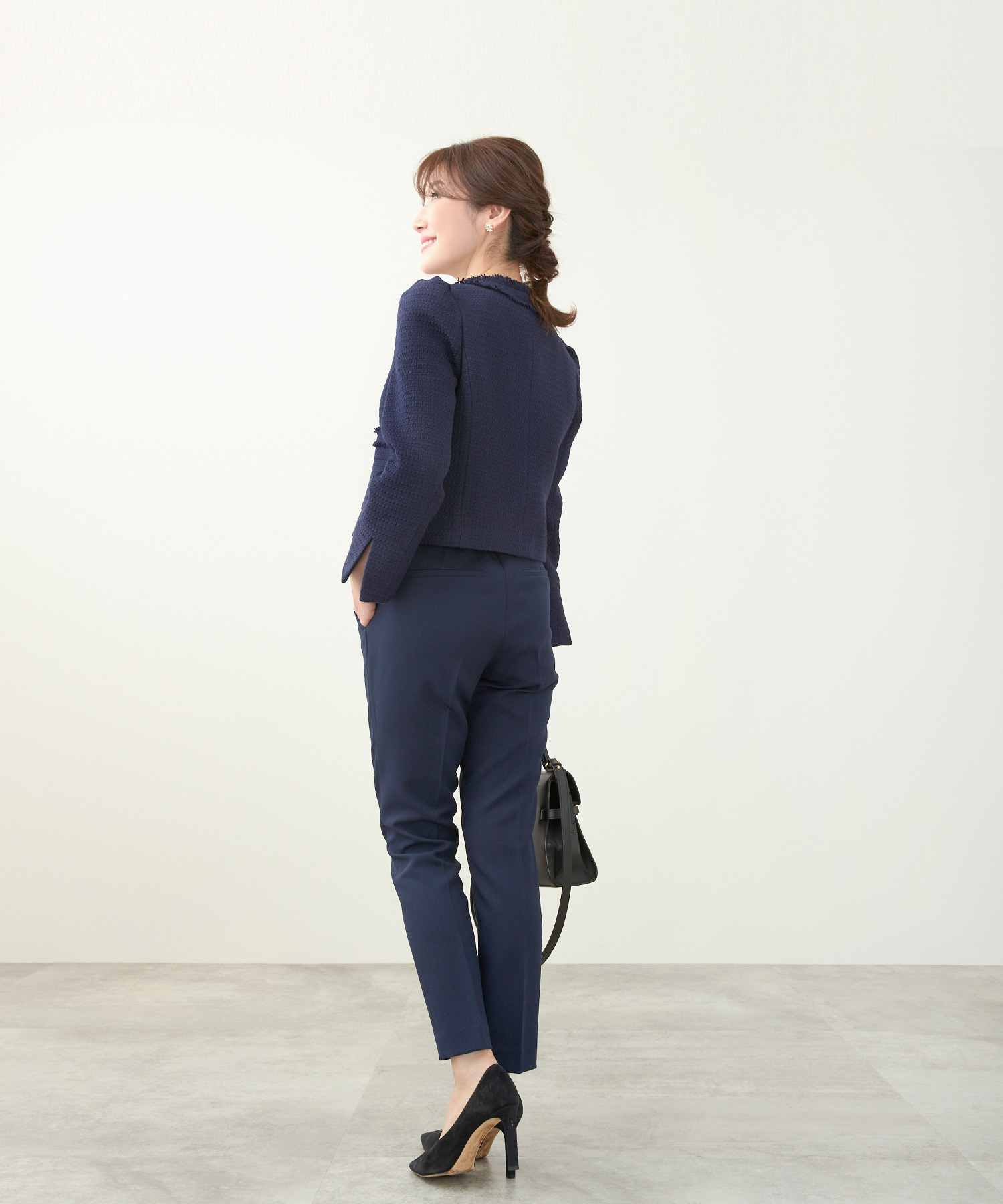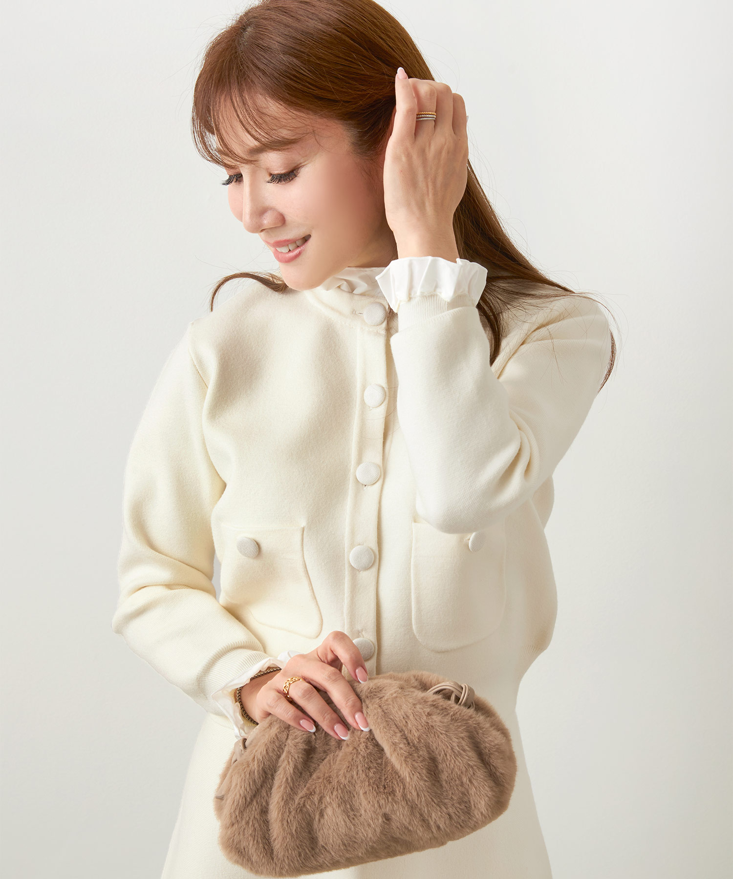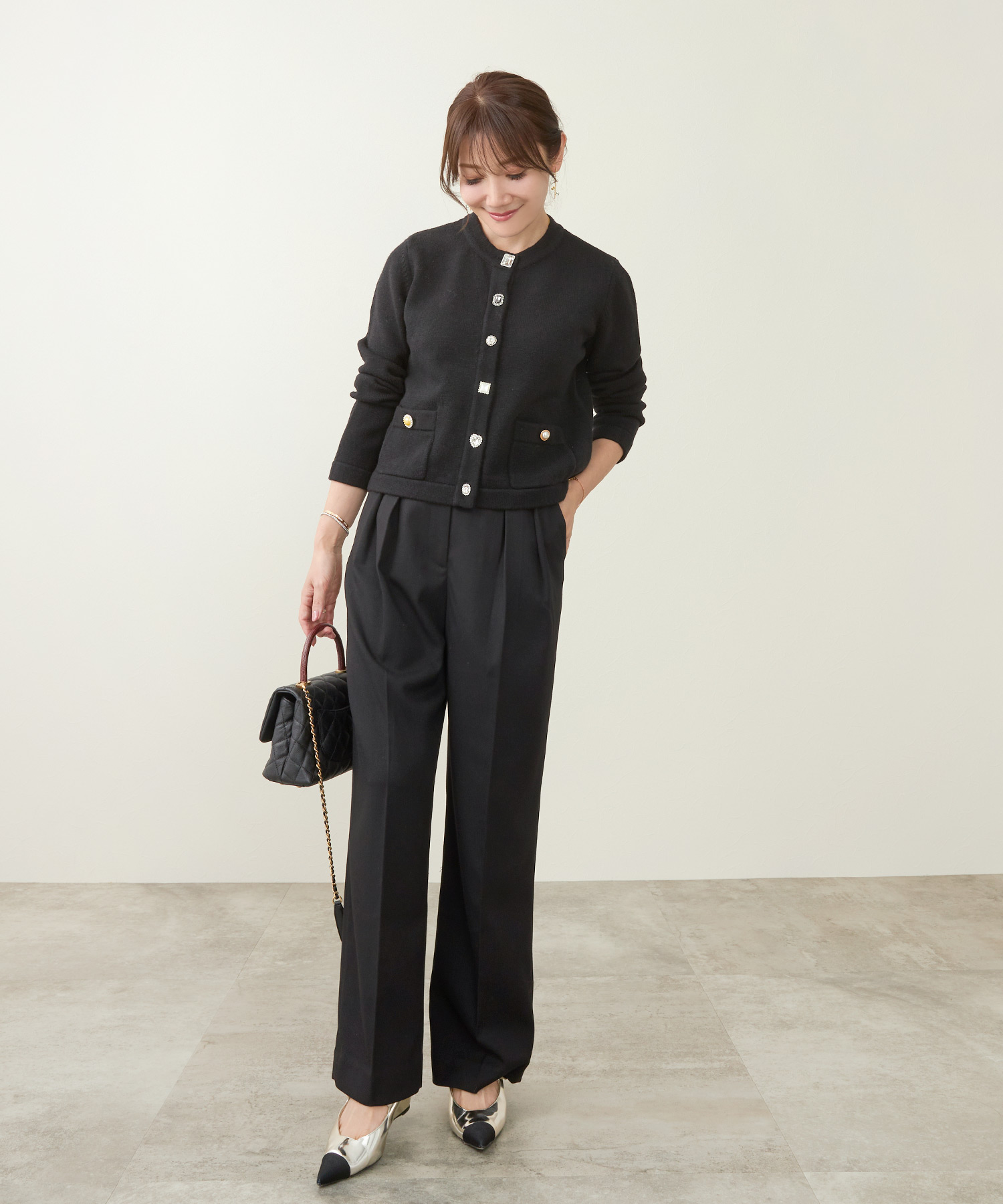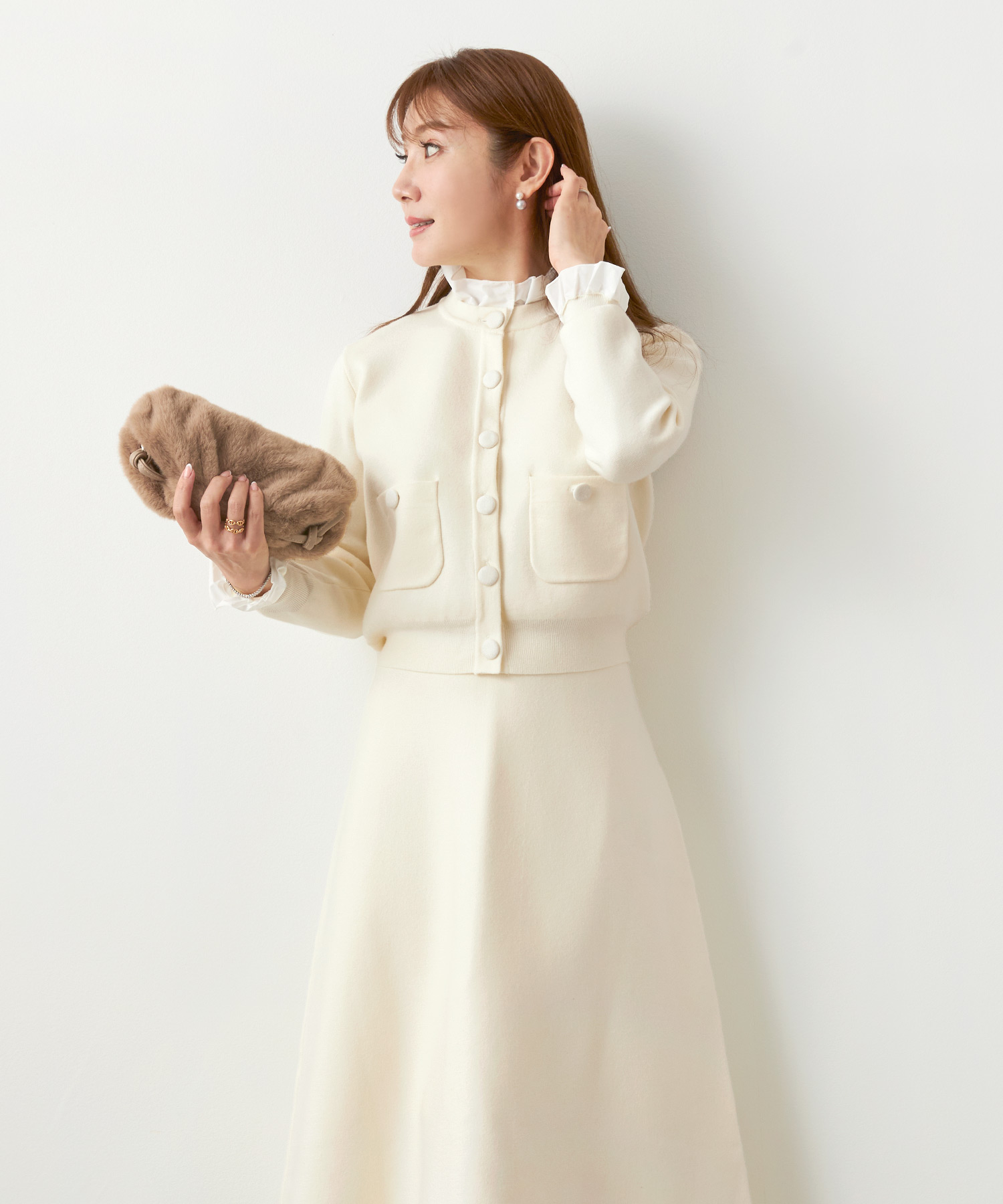 程よく肉厚なミラノリブ素材で、カーディガンながらノーカラージャケットのようなきちんと感を演出。襟元と袖にあしらわれた異素材フリルや、クラシカルなくるみボタンが、冬の授業参観にぴったりの華やかさを添えます。室内外の気温差に対応しやすく、ニットならではの軽やかさと柔らかな着心地も魅力。寒い季節の行事や通勤にも心強い一枚です。