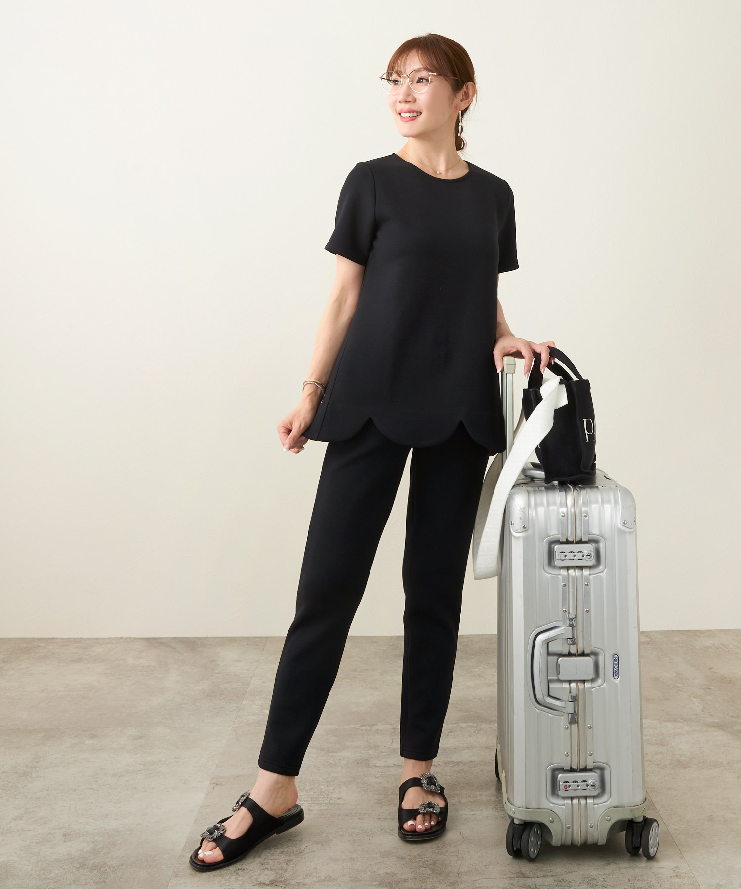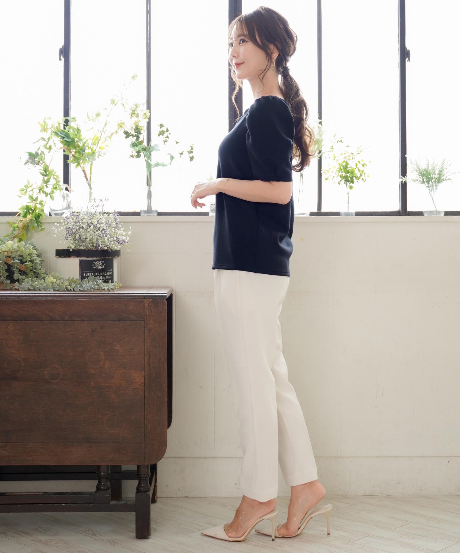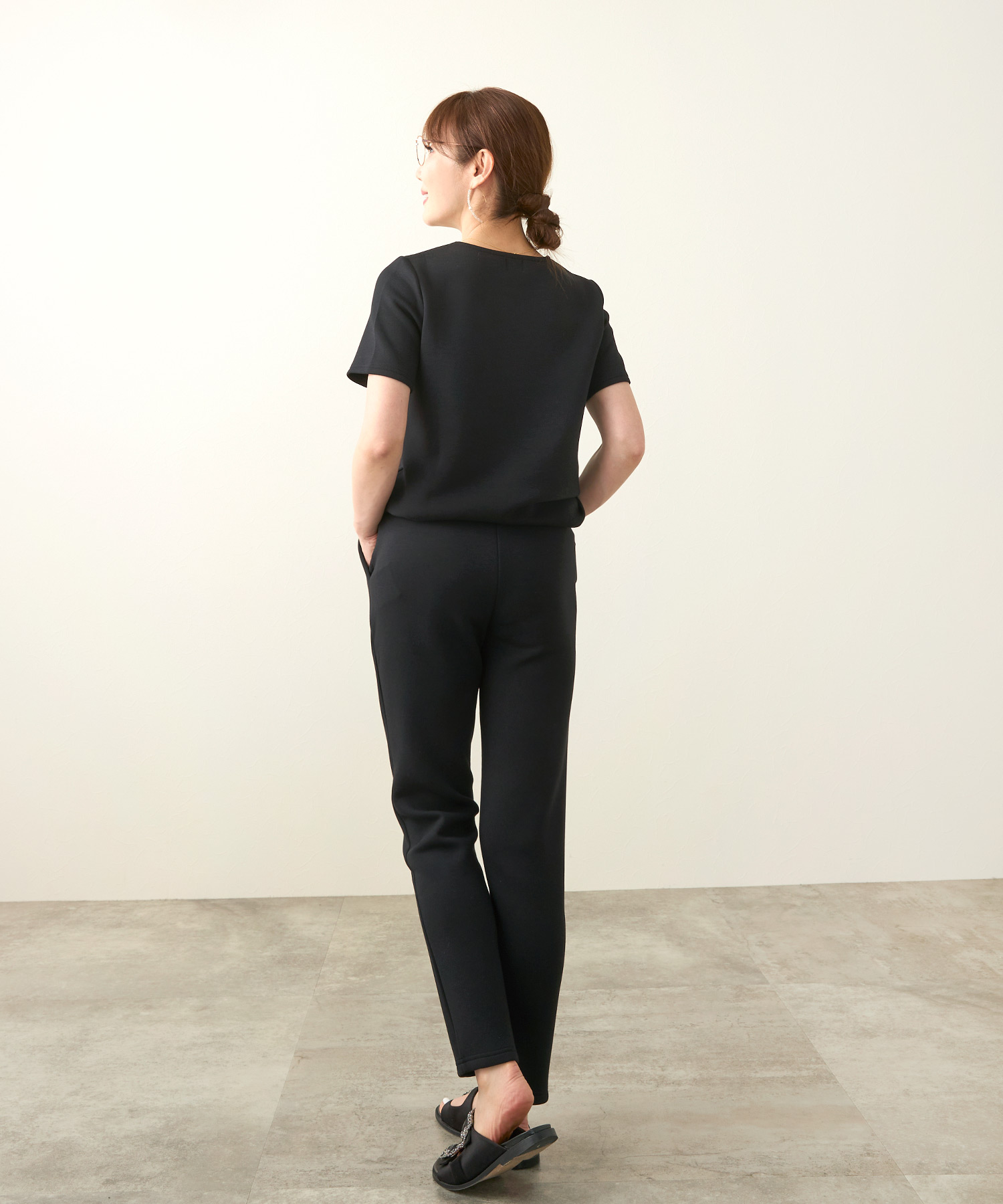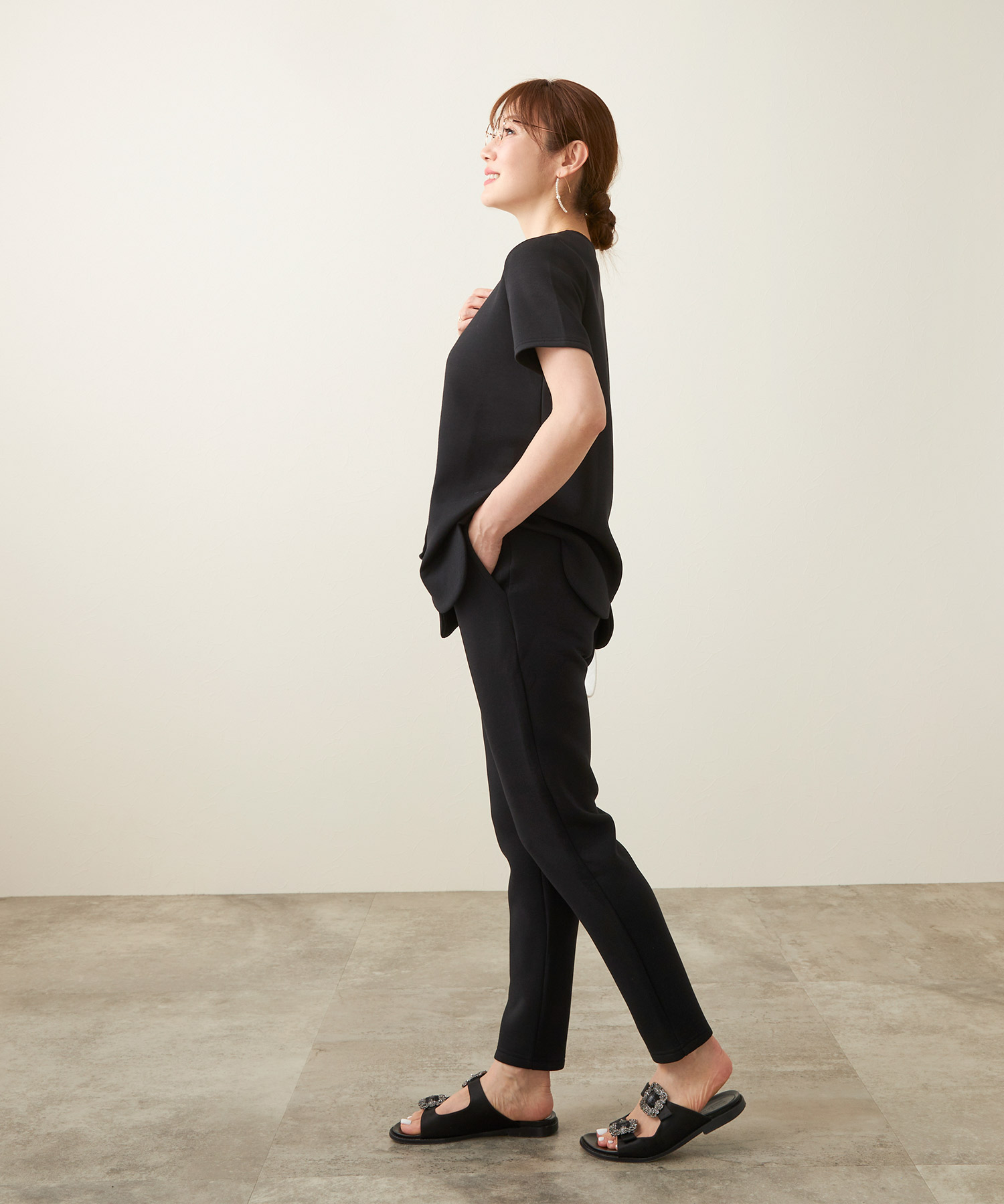 動きやすいのに、ネックや袖のディテールで品よく映える。もっちり素材&伸縮性で、着心地も軽やか&快適。パンツスタイルと好相性で、程よく力の抜けた大人の装いに。