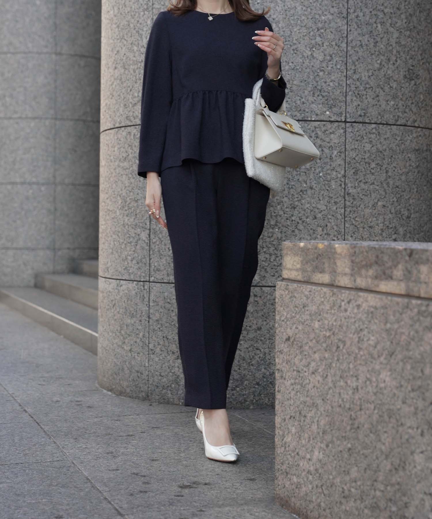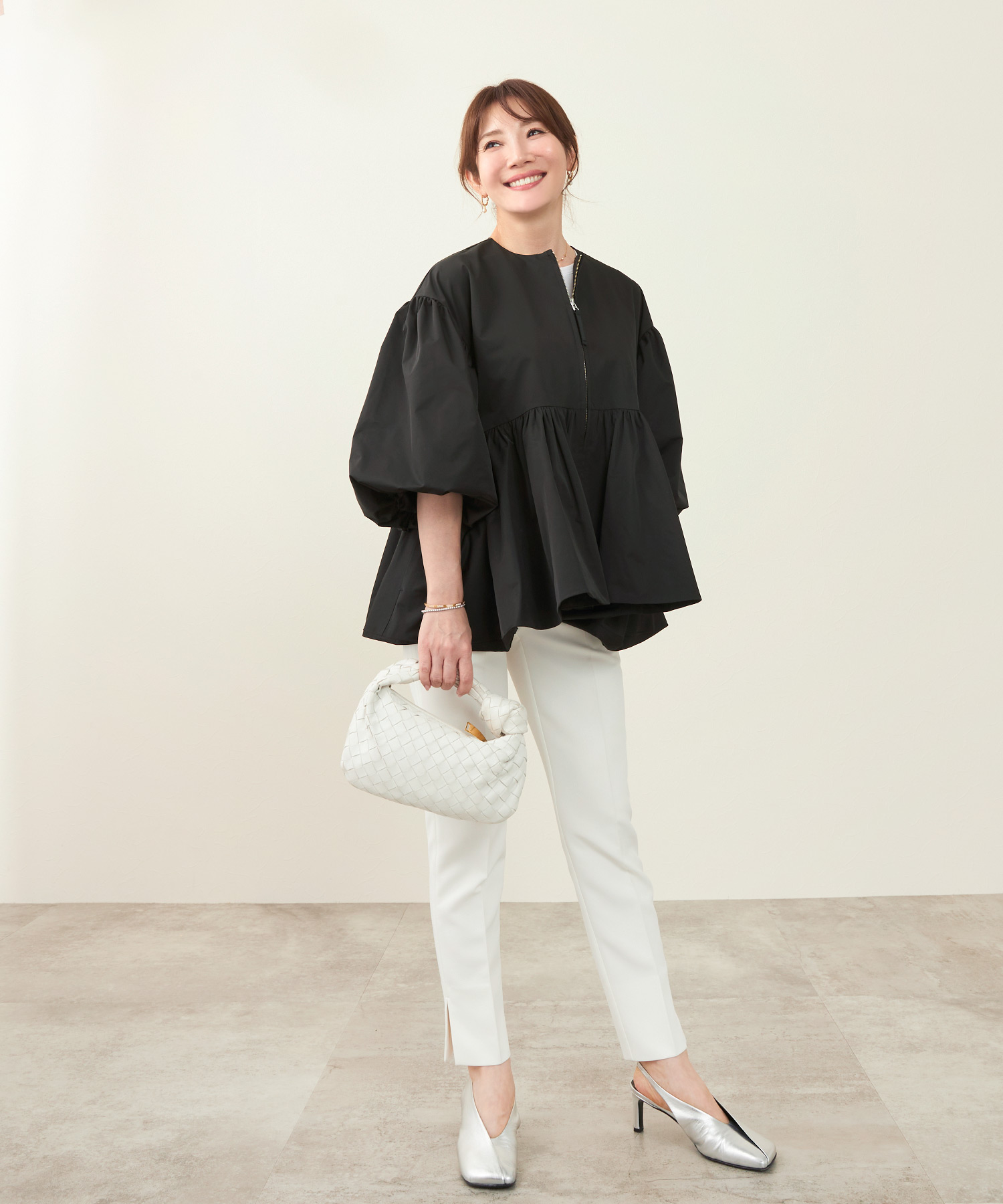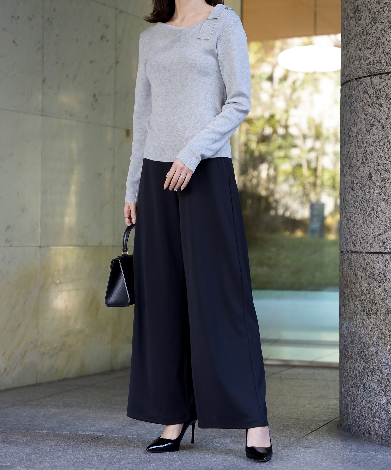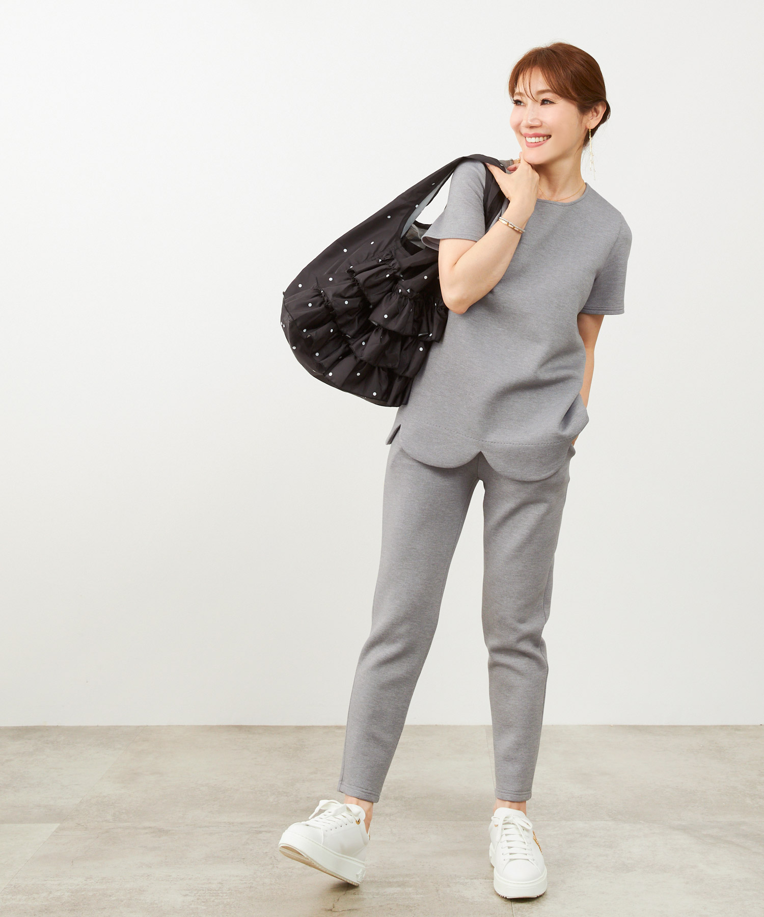 動きやすいのに、ネックや袖のディテールで品よく映える。もっちり素材&伸縮性で、着心地も軽やか&快適。パンツスタイルと好相性で、程よく力の抜けた大人の装いに。