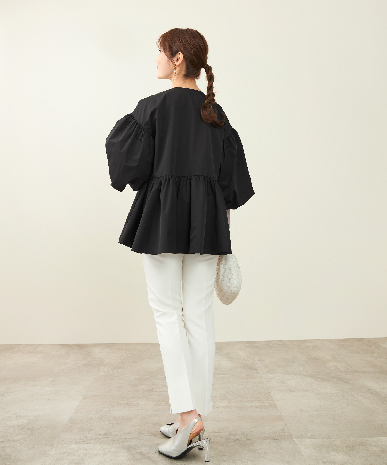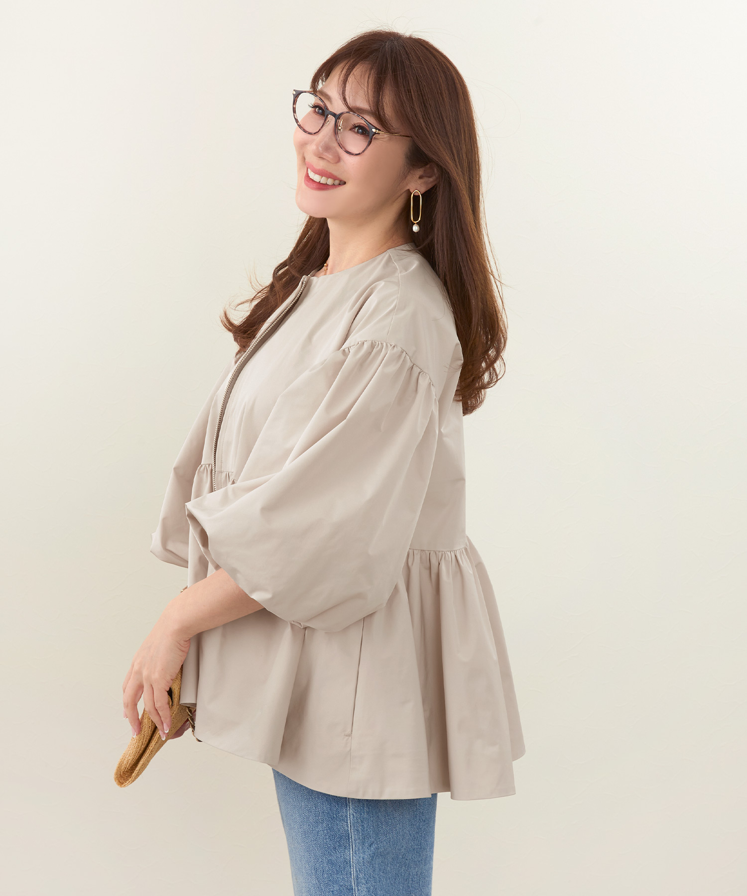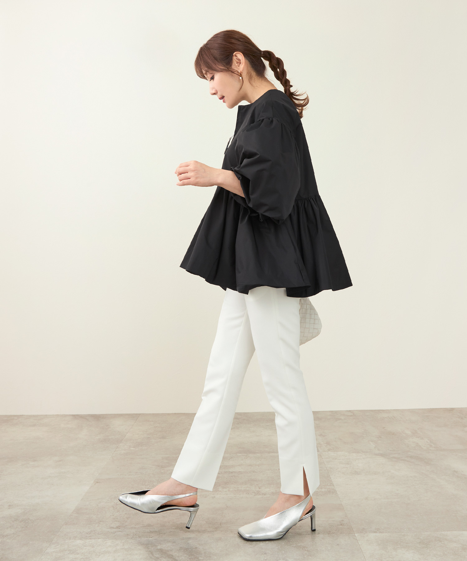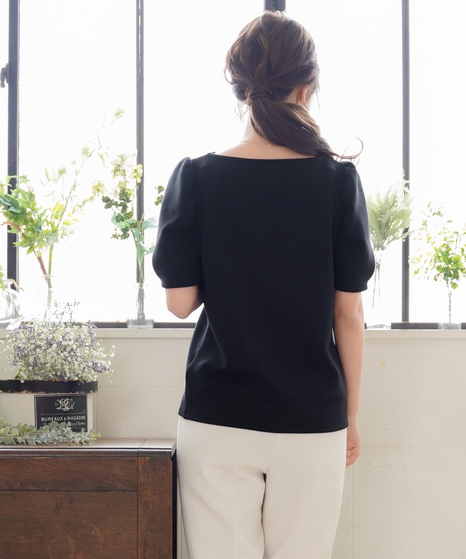 動きやすいのに、ネックや袖のディテールで品よく映える。もっちり素材&伸縮性で、着心地も軽やか&快適。パンツスタイルと好相性で、程よく力の抜けた大人の装いに。