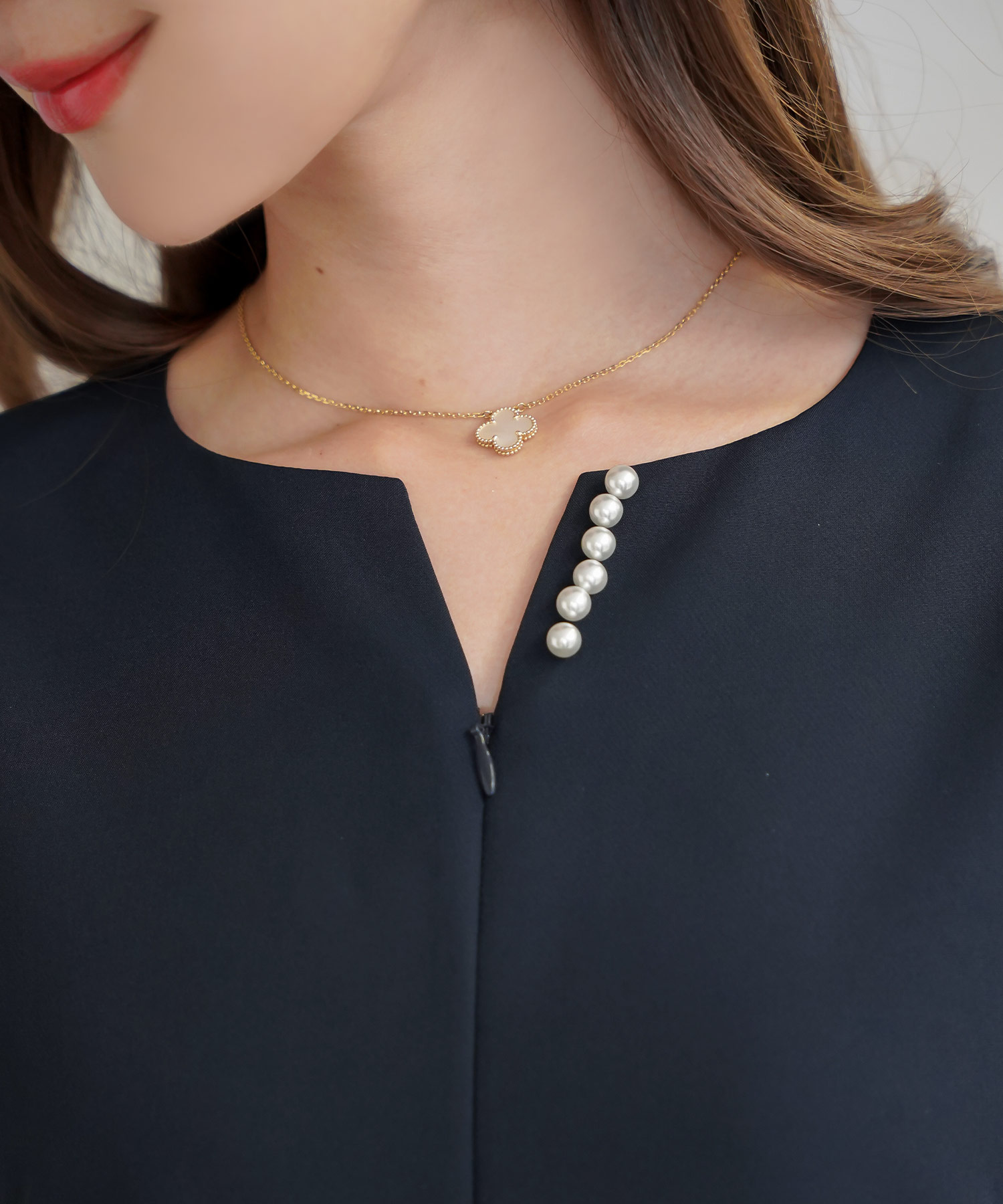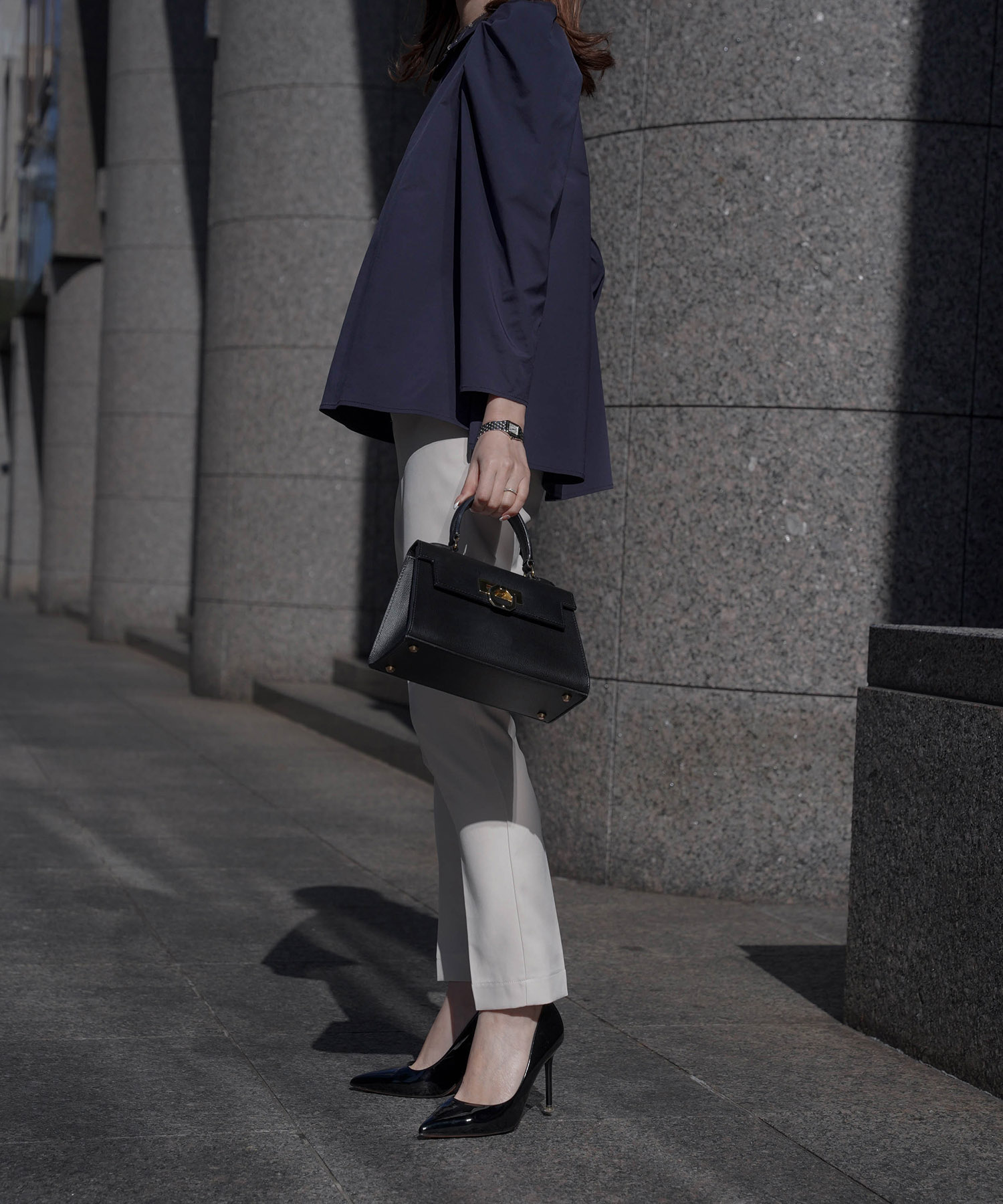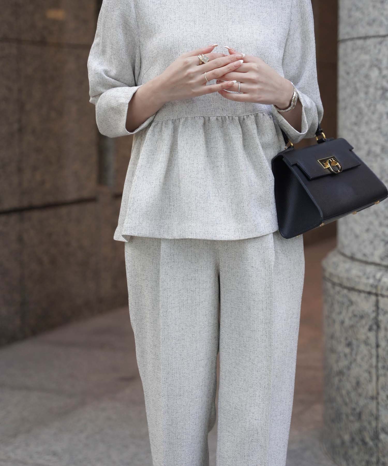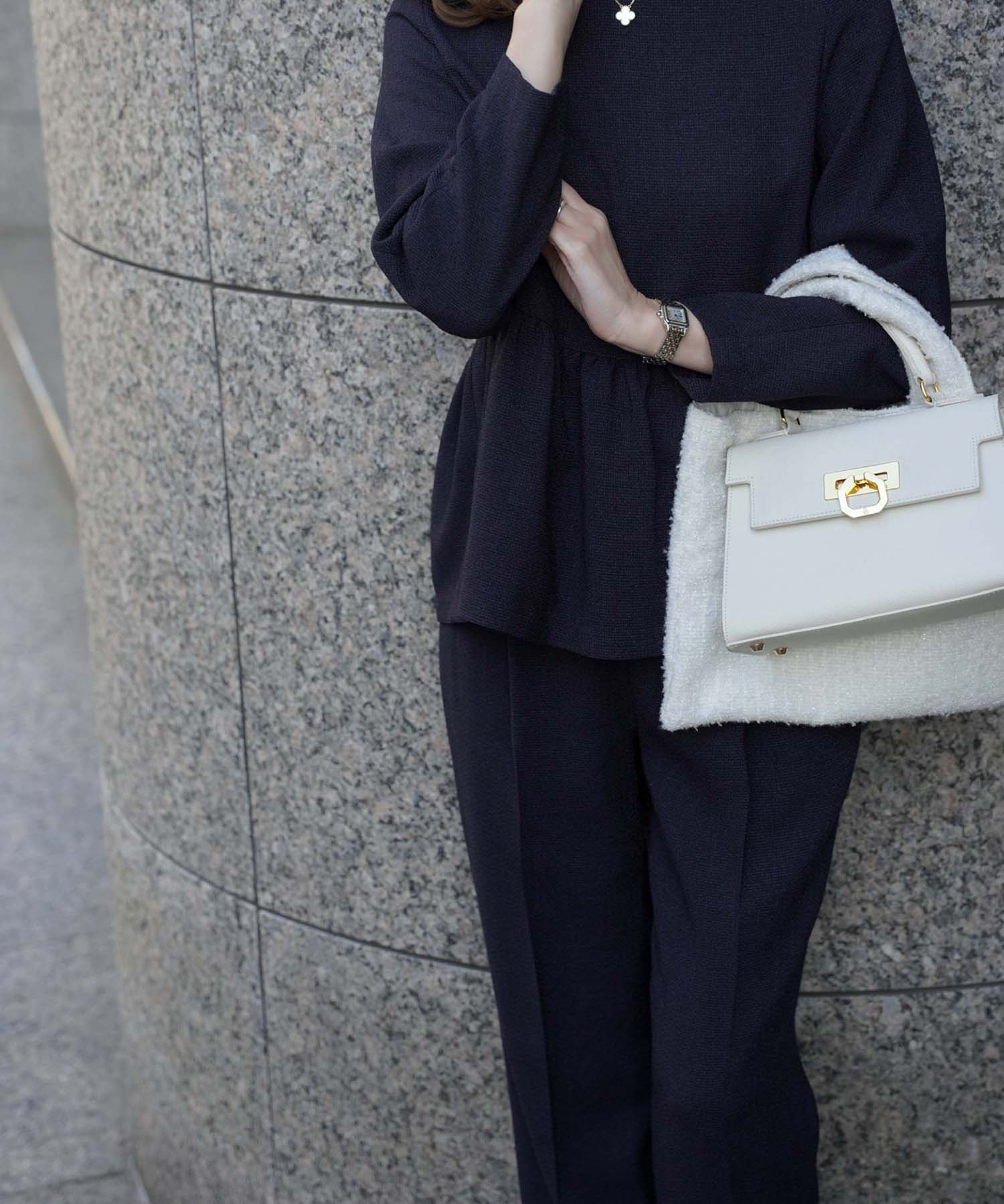 動きやすいのに、ネックや袖のディテールで品よく映える。もっちり素材&伸縮性で、着心地も軽やか&快適。パンツスタイルと好相性で、程よく力の抜けた大人の装いに。