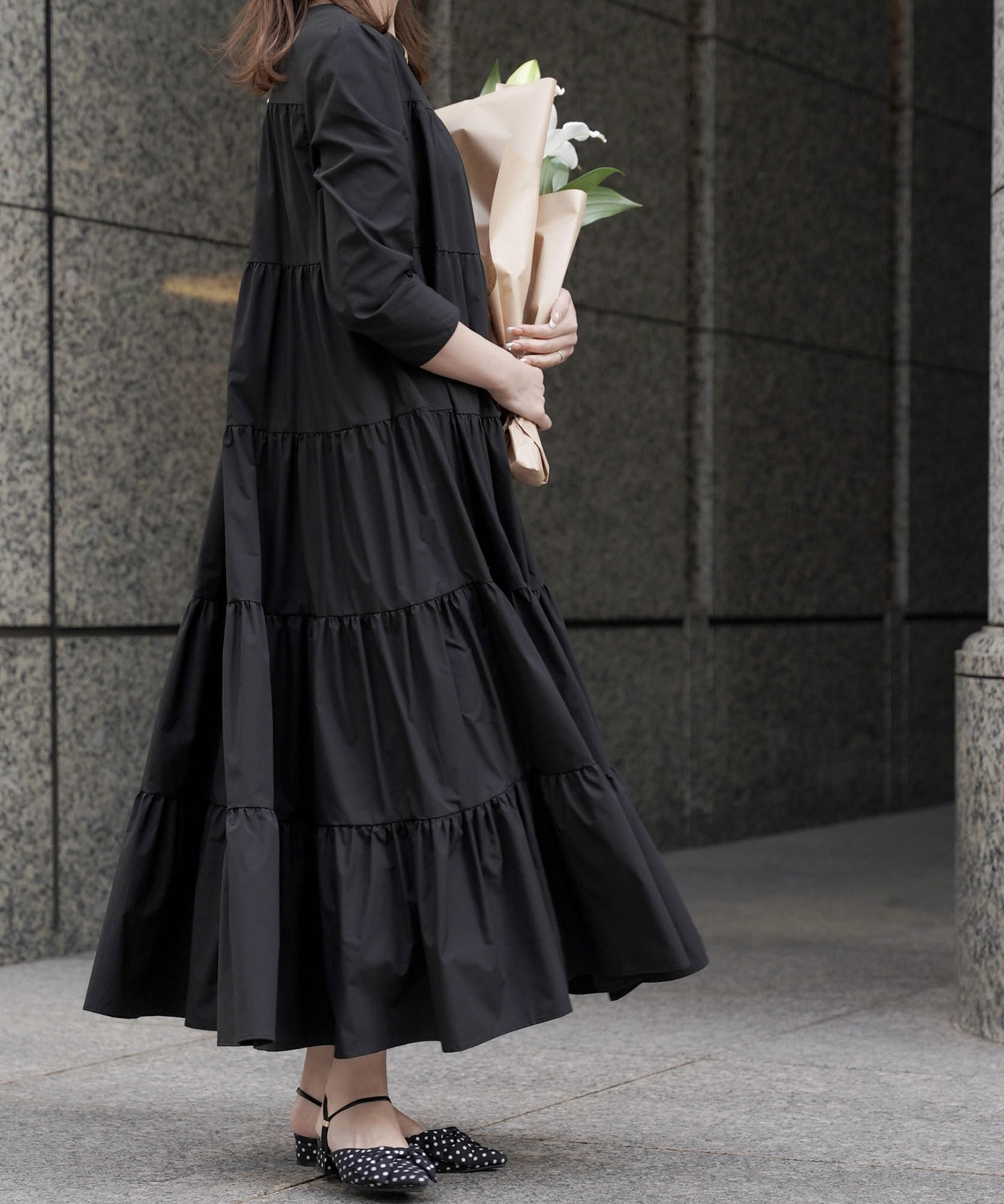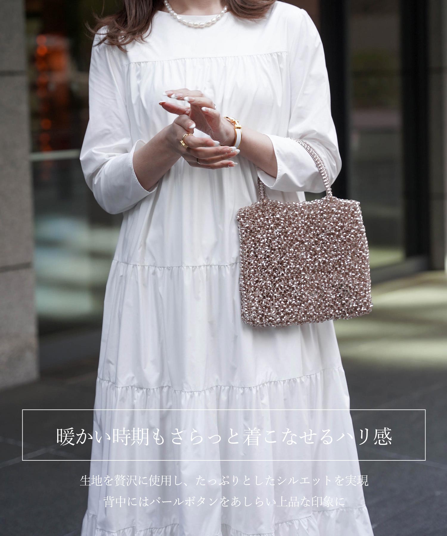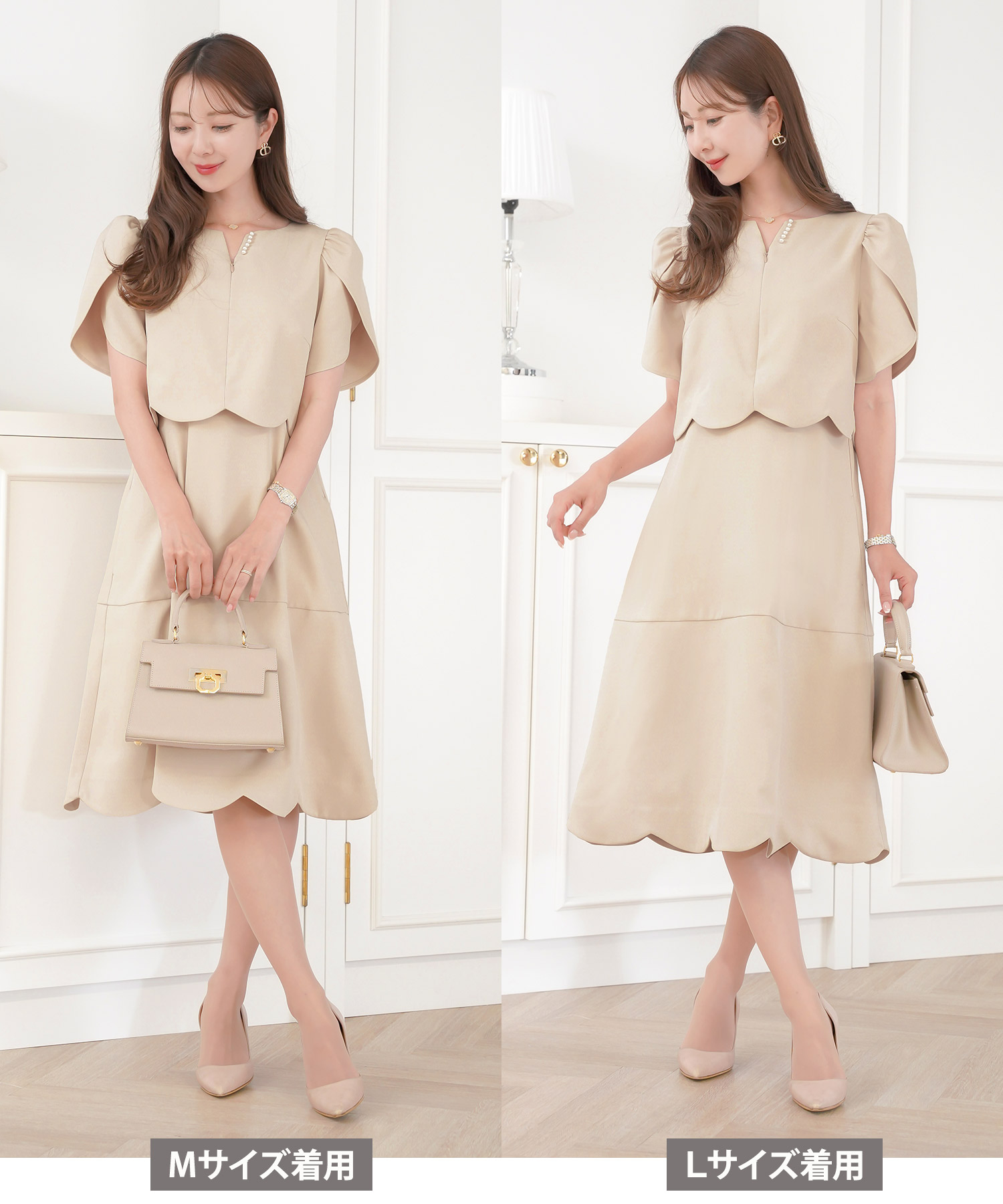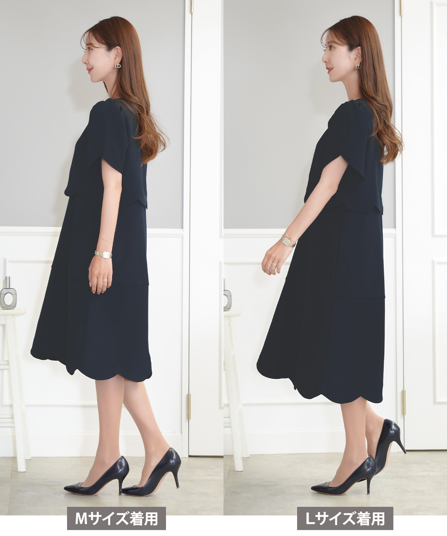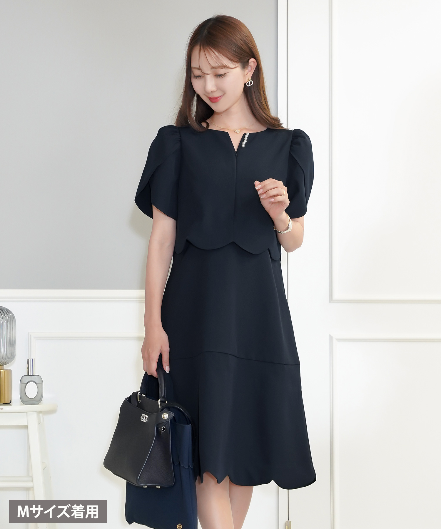授業参観にふさわしい、きちんと感と華やかさを兼ね備えたセミフォーマルワンピース。涼しげなチューリップスリーブや、可憐なスカラップデザインが印象的で、ほどよくフェミニンなムードを演出します。前開きファスナー仕様で授乳中のママにも配慮しつつ、ゆったりシルエットで体型カバーも叶うのが嬉しいポイント。きれいめコーデが求められる特別な日に、品よく映える一枚です。