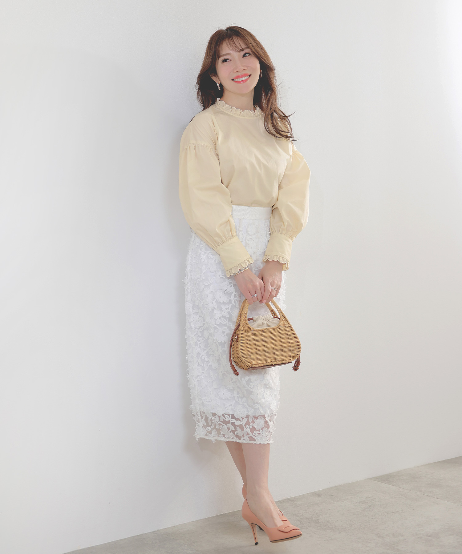 春の授業参観では、清潔感ときちんと感を兼ね備えた白ブラウスで印象をアップ。シンプルでありながら、襟元のフリルやスカラップが女性らしさを引き立てます。白のブラウスは顔映りを明るくし、レフ板効果で好感度をぐっと引き上げる優れもの。レースのタイトスカートできれいめに、デニムと合わせてカジュアルにも着こなせる一枚です。
