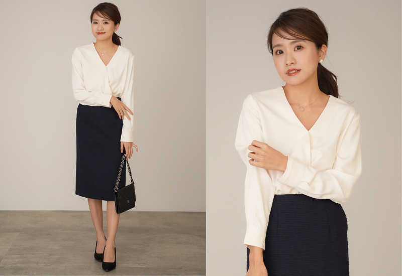 華やかブラウスとは打って変わってシンプルなタイプも見逃し厳禁! 通勤、会食、休日と幅広いシーンに対応可能でヘビロテ必至アイテムです。ブラウスはカシュクールデザインで、着るだけでおしゃれに決まる技ありデザインも高ポイント。黒のタイトスカート&パンプスでコンサバ風にかっちりと着こなして。