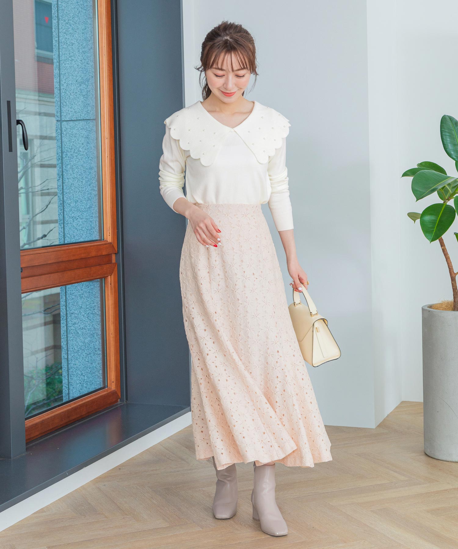 肩にかかるくらい大きな衿が印象的なニットプルオーバー。衿にあしらったパールの艶で美人度もアップします。レースのスカート合わせでとことん甘く仕上げるのが気分♪