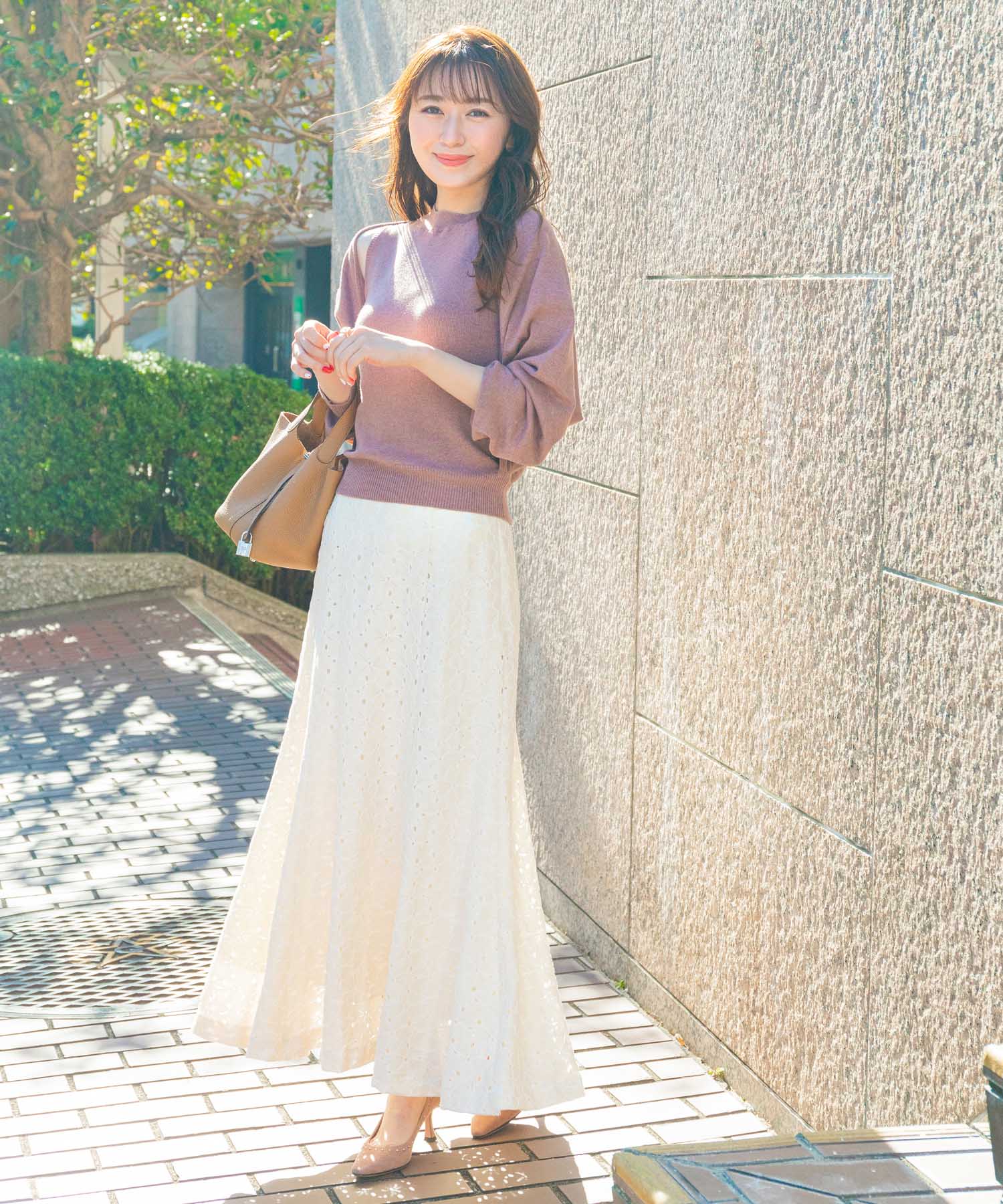 レディなマーメイドスカートを春はレース素材で愛らしくアップデート! 「アイレット・レース」を使用しているのでロング丈でも軽やかに仕上がります。肩にスリットの入った隙ありニットと組み合わせて簡単にモテスタイルの完成です♪