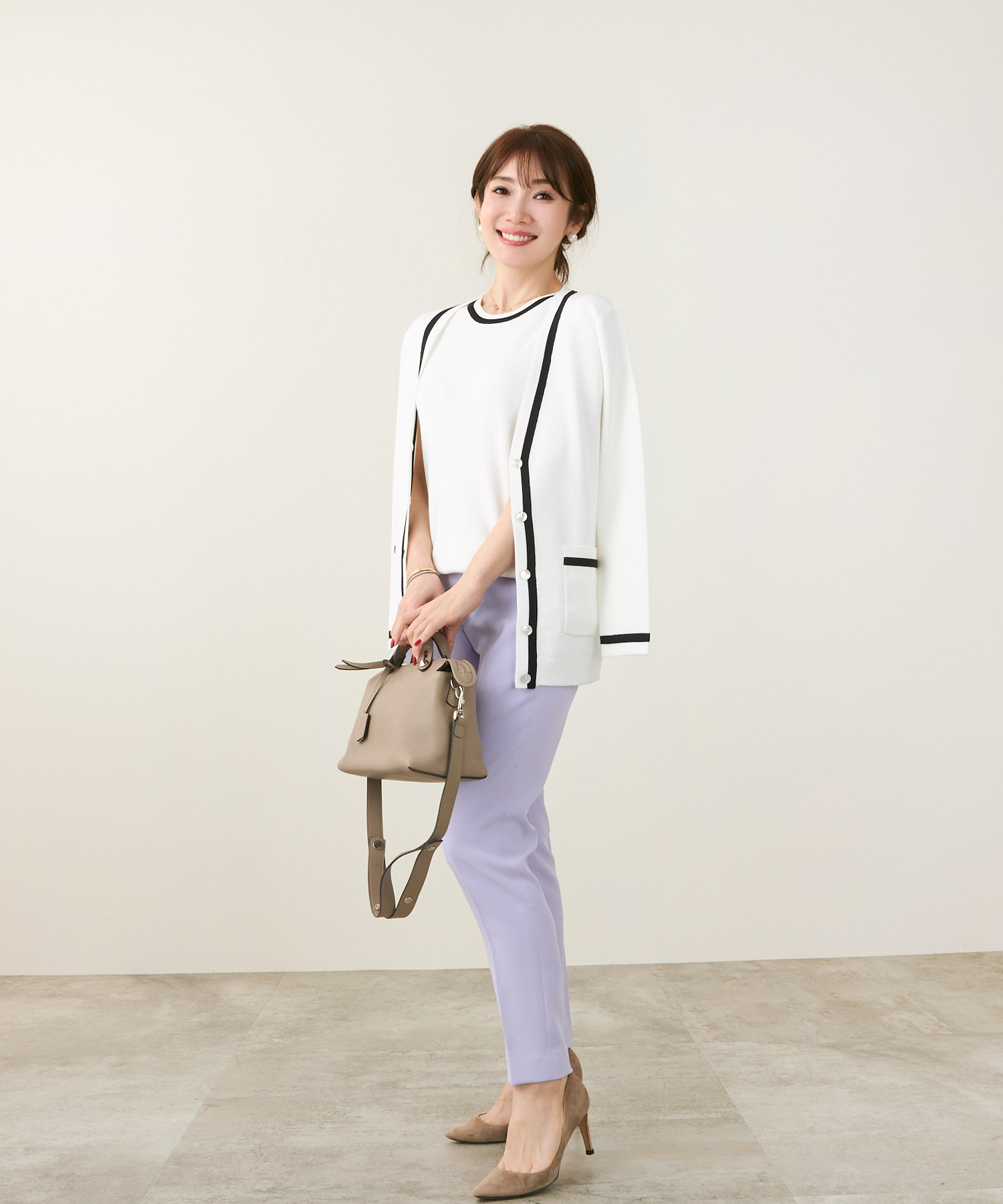 きれいめスタイルの代表アイテム・アンサンブルニットを合わせた上品で清楚なコーディネート。カーディガンの下は半袖ニットになっているので、気温差が激しい春は体温調整しやすいニットの長袖&半袖のアンサンブルが救世主に。差し色に春らしいラベンダーカラーのストレートパンツを選んで魅力アップに繋げて。