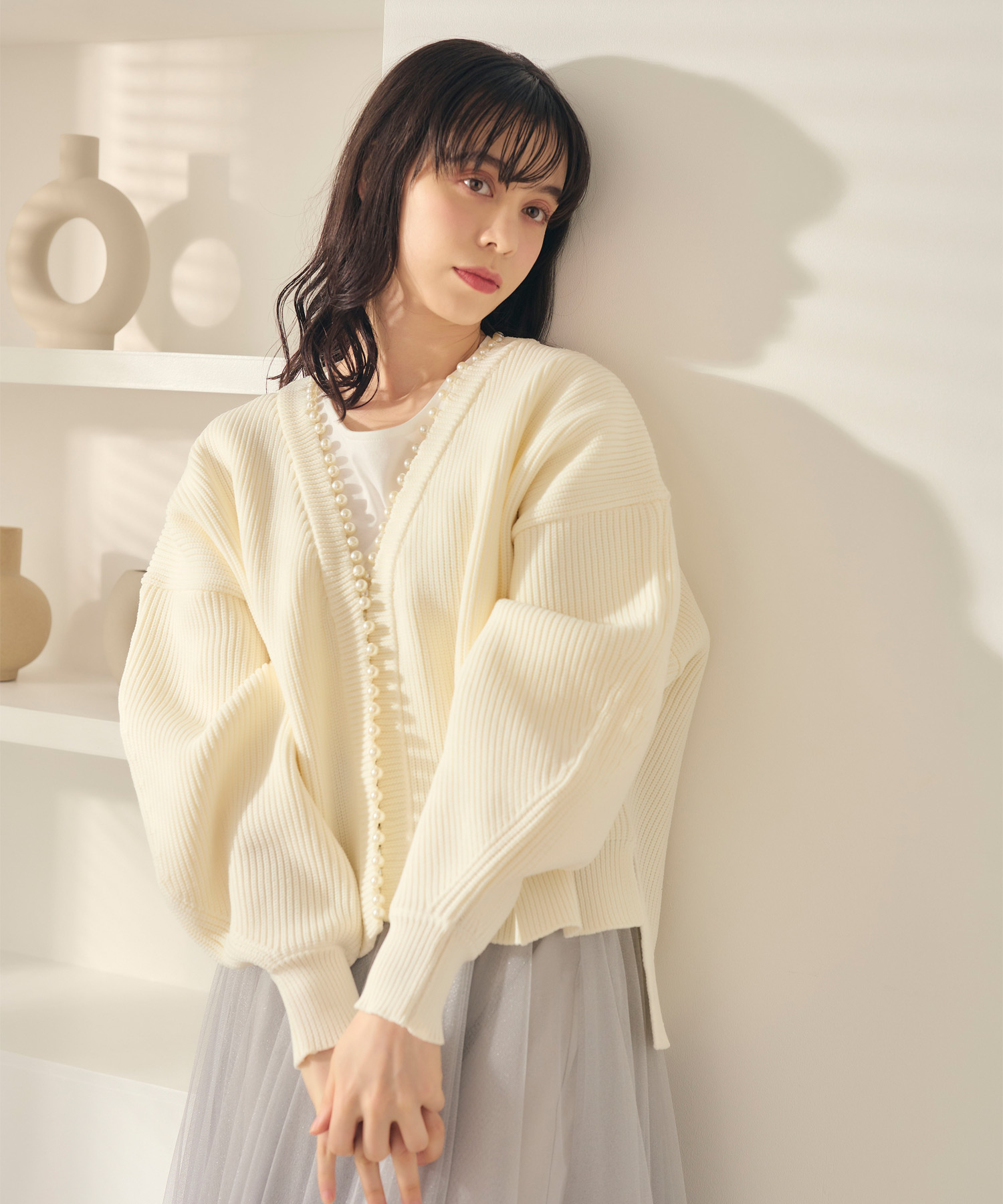 ふんわりとしたチュールスカートにざっくり編みのニットは好相性! しっかりした素材感でまだまだ寒い春先の防寒対策に一枚あると便利です。ピュアなホワイトカラーで守ってあげたくなる系女子に。
