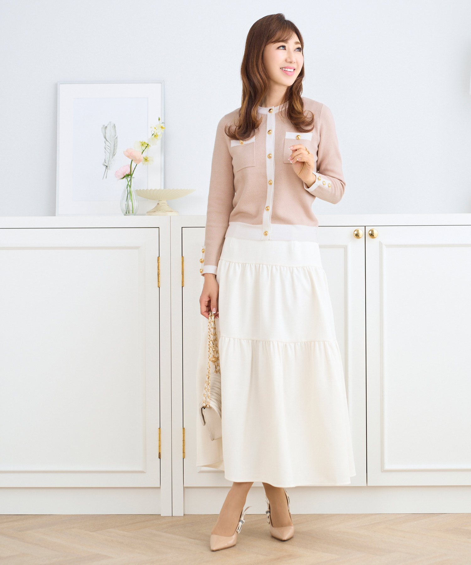 大人のワードローブに欠かせないロングスカートをリッチなホワイトで堪能。ジャケット風のニットカーディガンと合わせてきれいめ通勤コーデの出来上がり。ベージュ×ホワイトの上品配色で好感度アップにも貢献♡