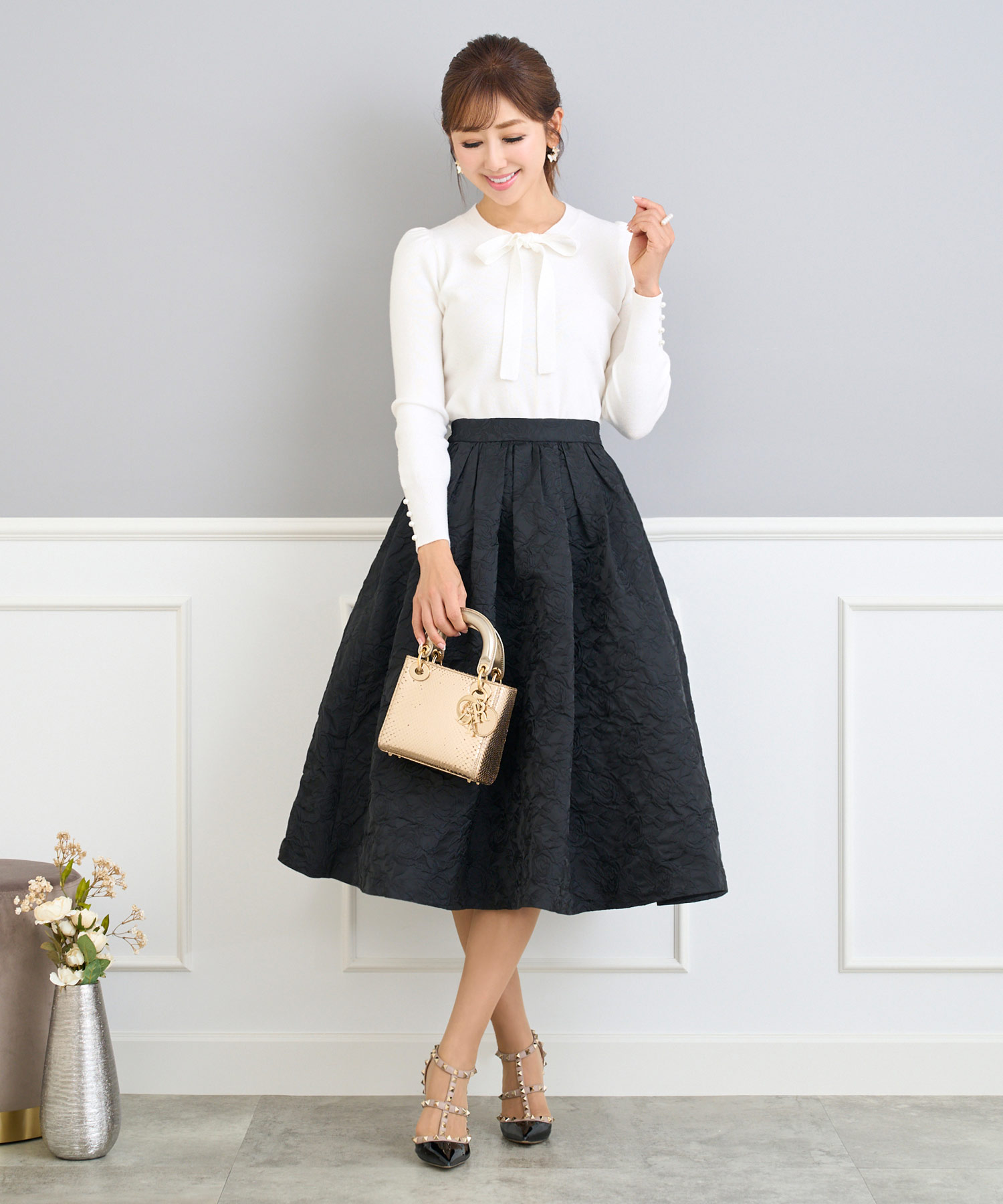 リボンタイニットとフレアスカートの王道フェミニンスタイル。シックだけれど華やかなスタイルでホテルディナーにもおすすめです!