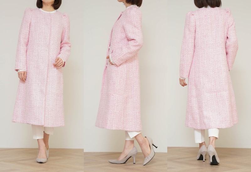 小柄な方におすすめなのがこの形。袖付け位置を内側に入れ込んだデザインは華奢な体型にぴったりで「アウターに着られている」感はほぼなし。また、ベーシックなロングコートながらウエスト部分は少しシェイプさせたくびれシルエットというところも見逃せません。上品なツイード素材で華やかな着こなしを楽しんで♪