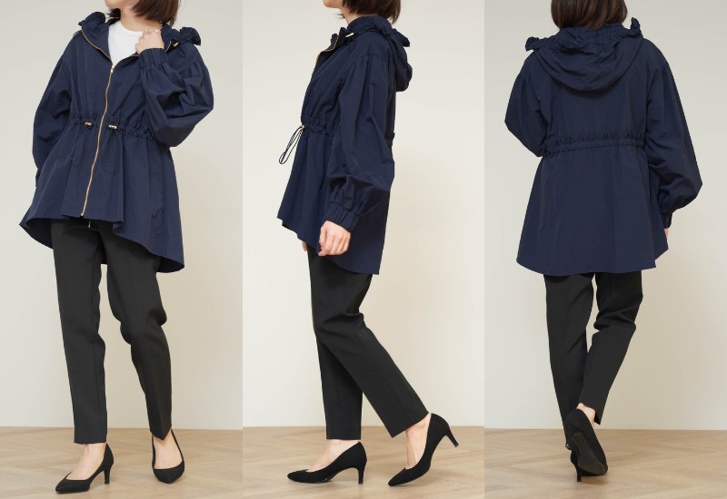 上でも紹介した撥水加工を施したロングコートと同素材のブルゾン。急な小雨でも対応できるのは自転車通勤者にとっても嬉しい限り! アクティブ派には汚れが目立ちにくいネイビーカラーがおすすめです。裾フリルで程よく女性らしさも演出できます。