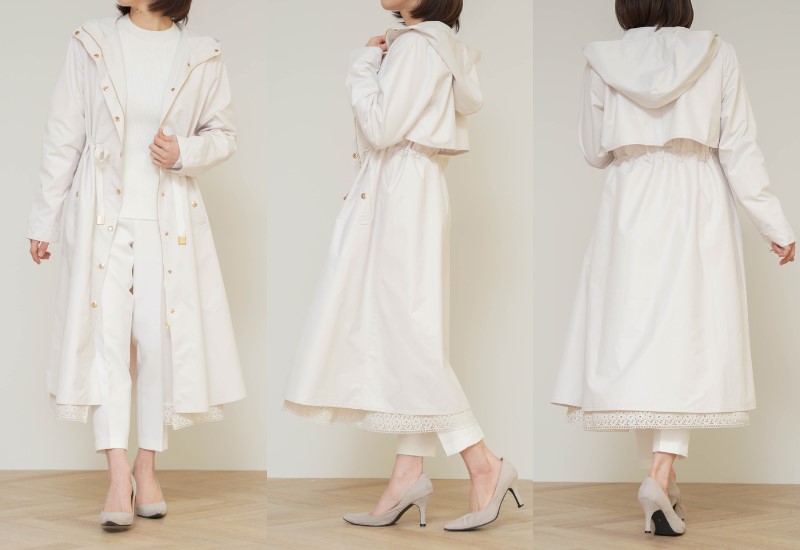 気分の上がるピュアホワイトのアウターは撥水機能付きで多少の雨なら弾いてくれる優秀アイテム。憂鬱な気分になりやすい雨の日もあえて全身白のワントーンでハッピーに♪フード付きデザインなので視線が上がって、縦に長く見える効果も期待できます♡