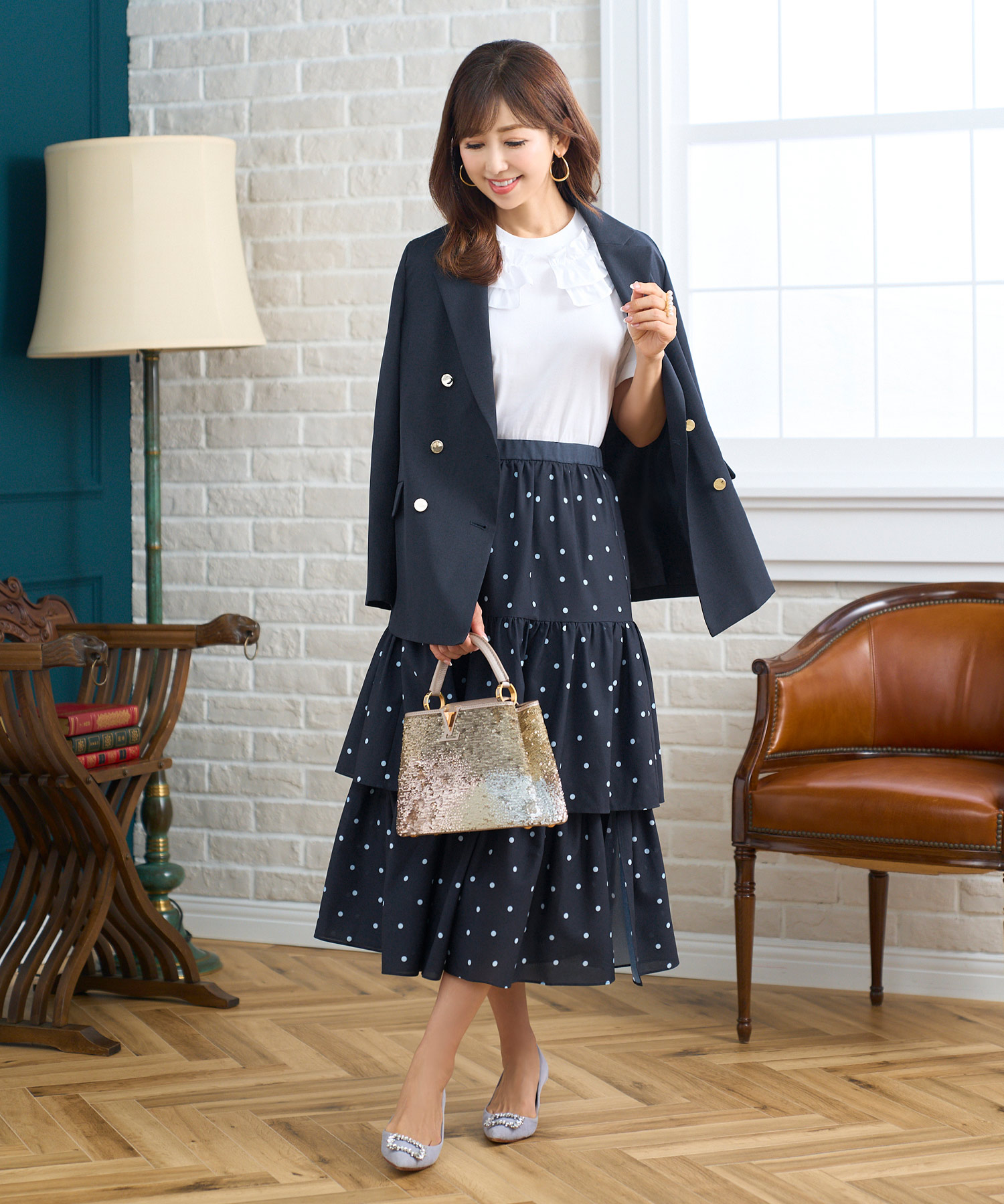 会社帰りにそのまま同僚たちとお花見に行くなら、テーラードジャケットにティアードスカートを合わせたフェミニンなオフィスカジュアルスタイルで参戦! スカートのドット柄がアクセントになるので、全身ネイビー色でまとめても沈んで見えません。キラッとアクセサリーを退勤後に盛って、イベント感をアピール!