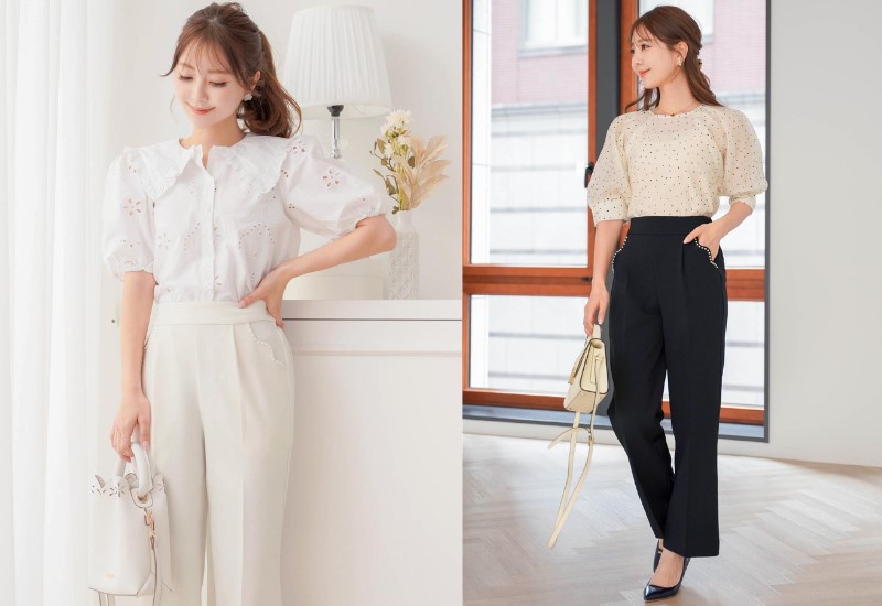 レジャーシートに座ってまったりするならパンツスタイルがおすすめ。長時間座っても快適な伸縮性のある素材がマストです。リラクシーなデニムパンツもよいですが、お花見後にレストランへ行く予定があるなら、きちんと感のあるパンツがよいでしょう。ポケット口にパールが付いているのでエレガントに履きこなせます。ボトムスの色は、歩いて散歩するだけならアイボリーを選択するのもあり!白のブラウスと合わせてとことん爽やかに。