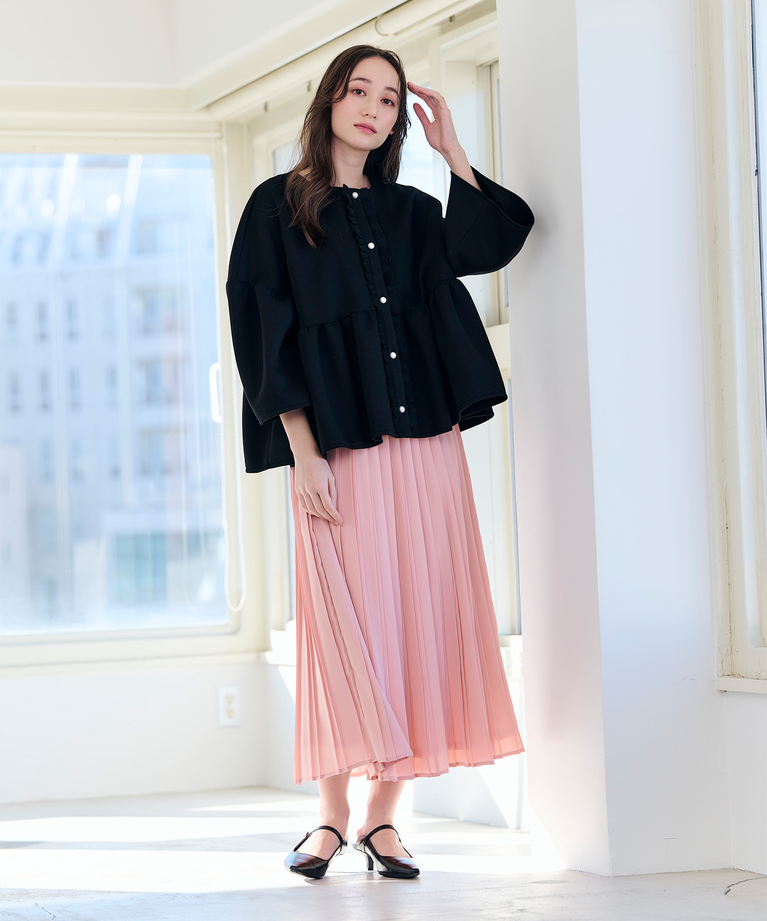 ●ピンクのプリーツスカートコーデ